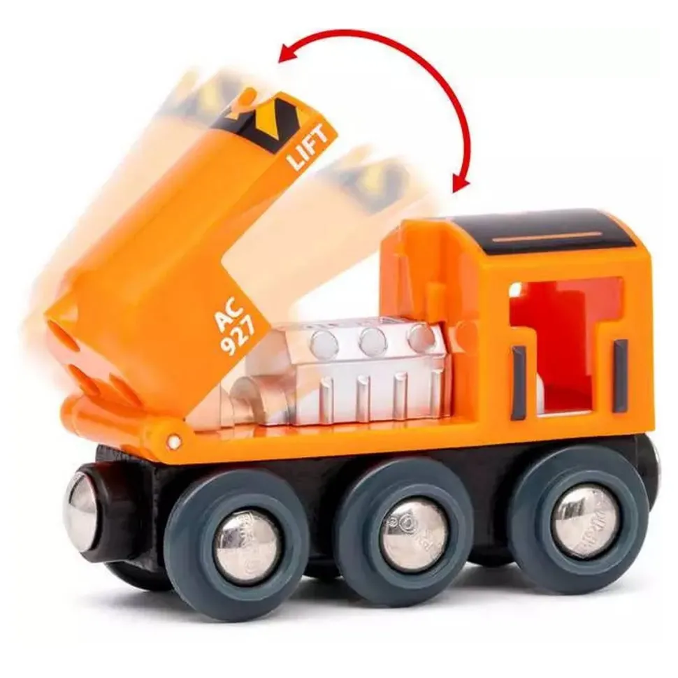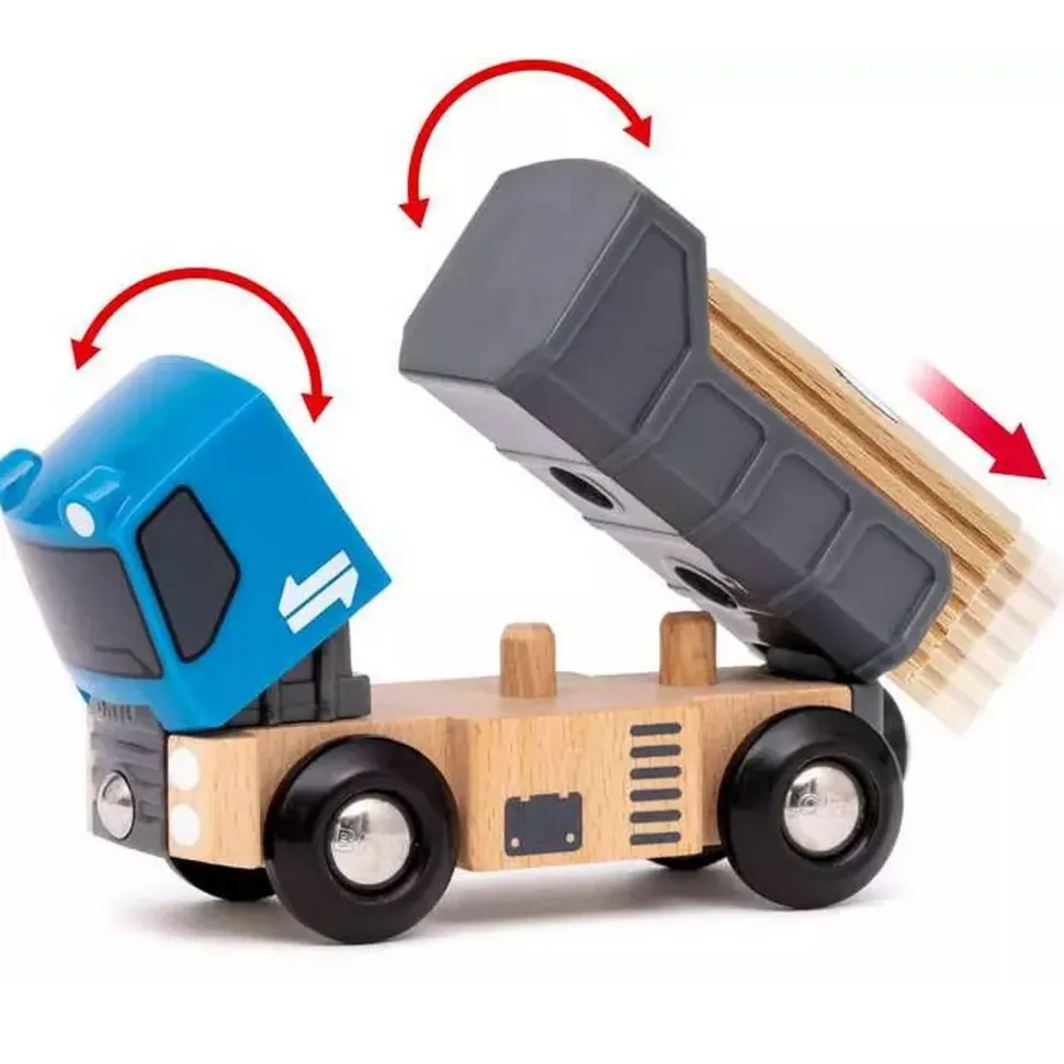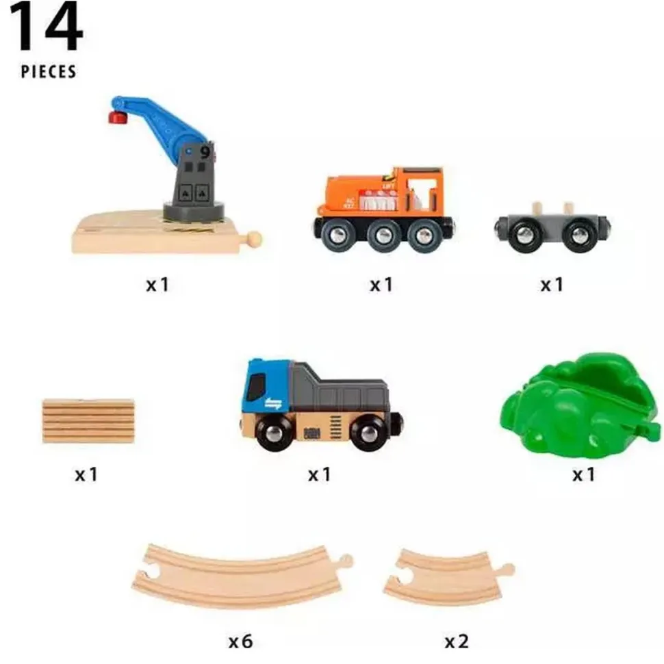 Contenu : 1 train de marchandises, 1 camion, 1 grue de levage et de chargement, 1 wagon de marchandises, 1 cargaison, 1 rail décoré, 8 rails en bois.