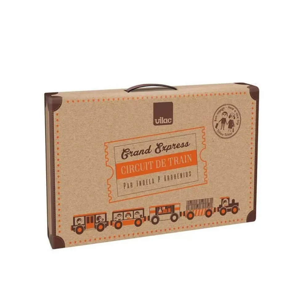 Montez à bord du train Grand Express de Vilac, un circuit en bois illustré par Ingela P.Arrhenius pour les enfants à partir de 3 ans présenté dans une valisette vintage.