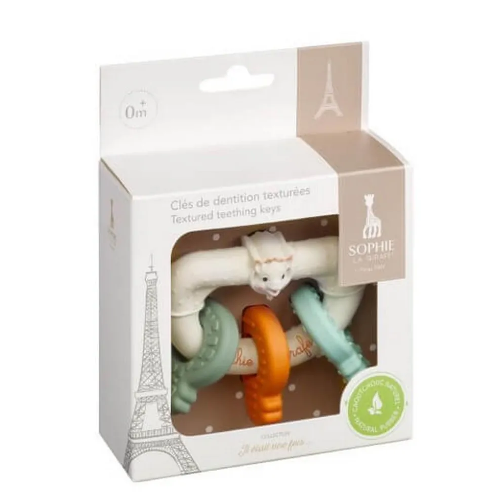 Découvrez la Cles de dentition texturées Sophie la girafe de la marque Vulli. Fabriqué à partir de caoutchouc 100 % naturel, cet anneau de dentition a été pensé pour accompagner bébé tout en douceur lors de ses poussées dentaires. Il est composé de 3 jolies petites clés colorées, faciles à attraper par les petites mains et parfaitement adaptées à la bouche de bébé. Souples et texturées, elles offrent différentes sensations à mordiller, ce qui aide à soulager efficacement les gencives sensibles. Un jouet à la fois ludique et apaisant, à emporter partout !