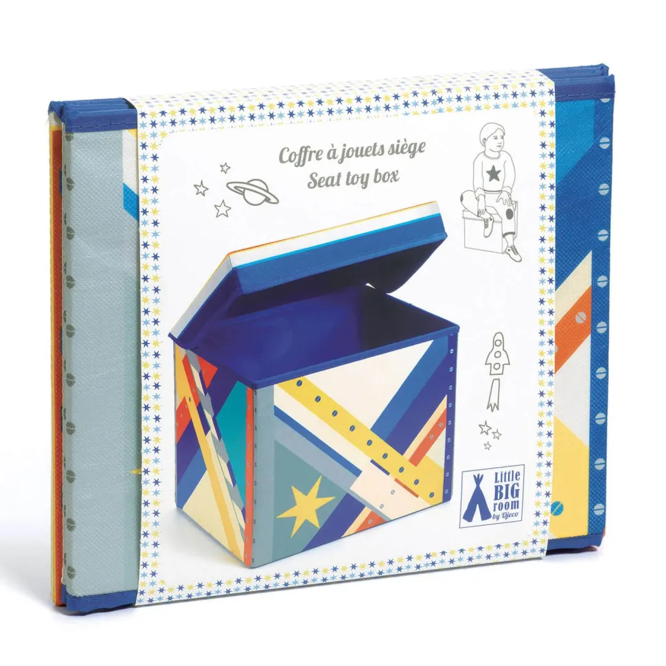 Un coffre à jouets coloré sur le thème de l’espace. Un joli objet de décoration parfait pour que tout soit bien rangé !