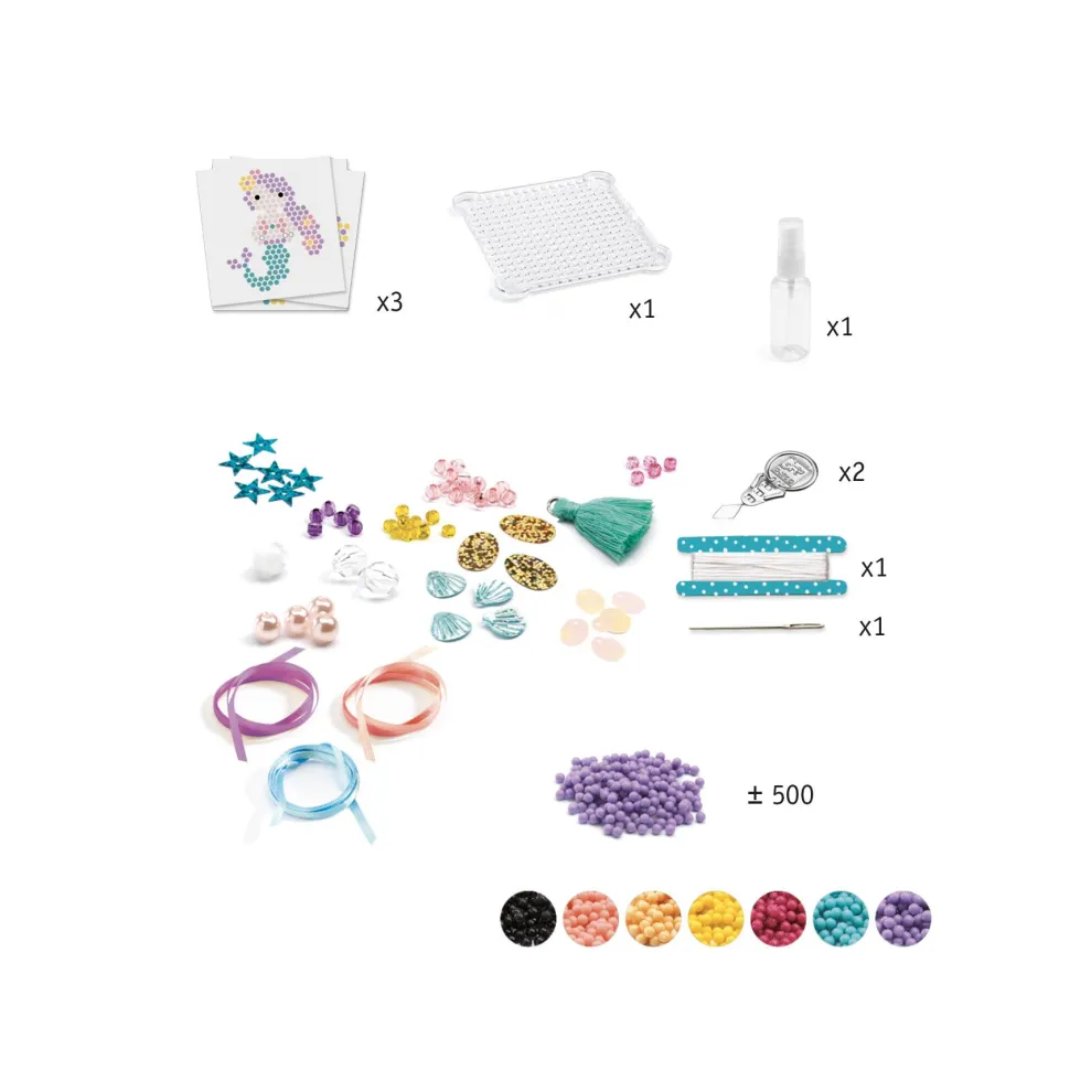 Avec ce kit créatif, vos enfants réalisent de jolies suspensions sur le thème marin. Il suffit d’assembler les perles sur la plaque alvéolée et sous l’action de l’eau, elles adhérent les unes aux autres comme par magie ! Une sirène, un poisson et un hippocampe à créer très facilement.