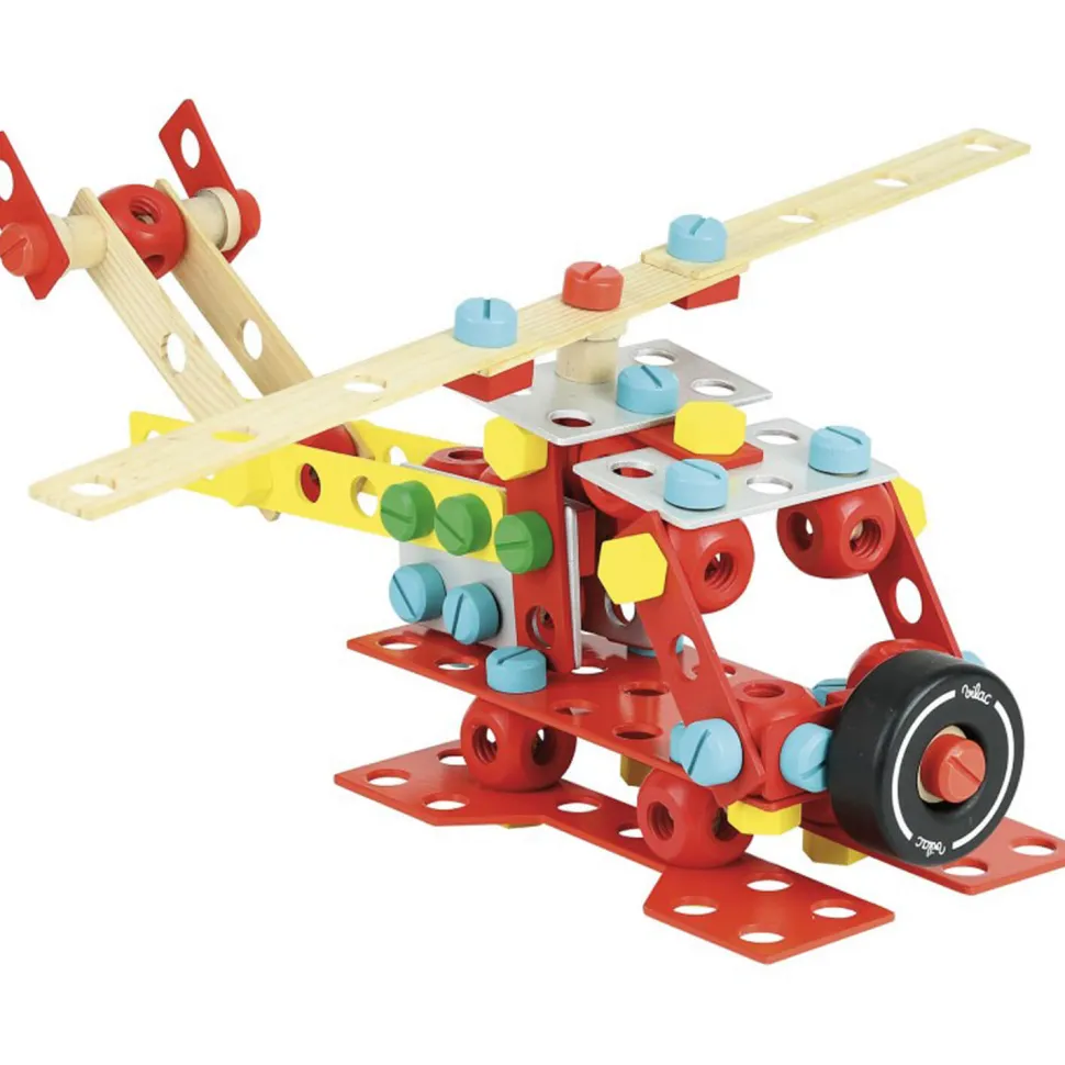 Un super coffret de pièces en bois pour des possibilités de construction à l’infini !Ce coffret Super Batibloc permet de réaliser pas à pas 6 nouvelles constructions différentes ! Avec plus de 100 pièces en bois, il vous permettra aussi de laisser libre cours à votre imagination et de réaliser des édifices ou des véhicules impressionnants ! Tout un univers où patience, coordination et imagination seront de précieuses qualités. Contenu : – Planches à trous en bois- Vis- Ecrous. – livret de modèles à réaliser- outils adaptés Une activité pour satisfaire votre envie de construire, d’assembler, de faire des monuments impressionnants… Le livret de modèles vous aidera à devenir un vrai bâtisseur.Dimensions : 52 x 29 x 4 cm.