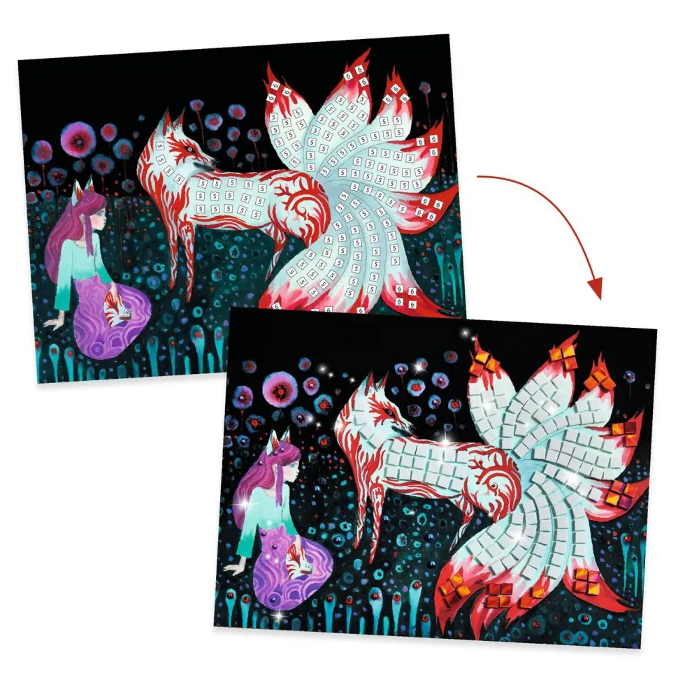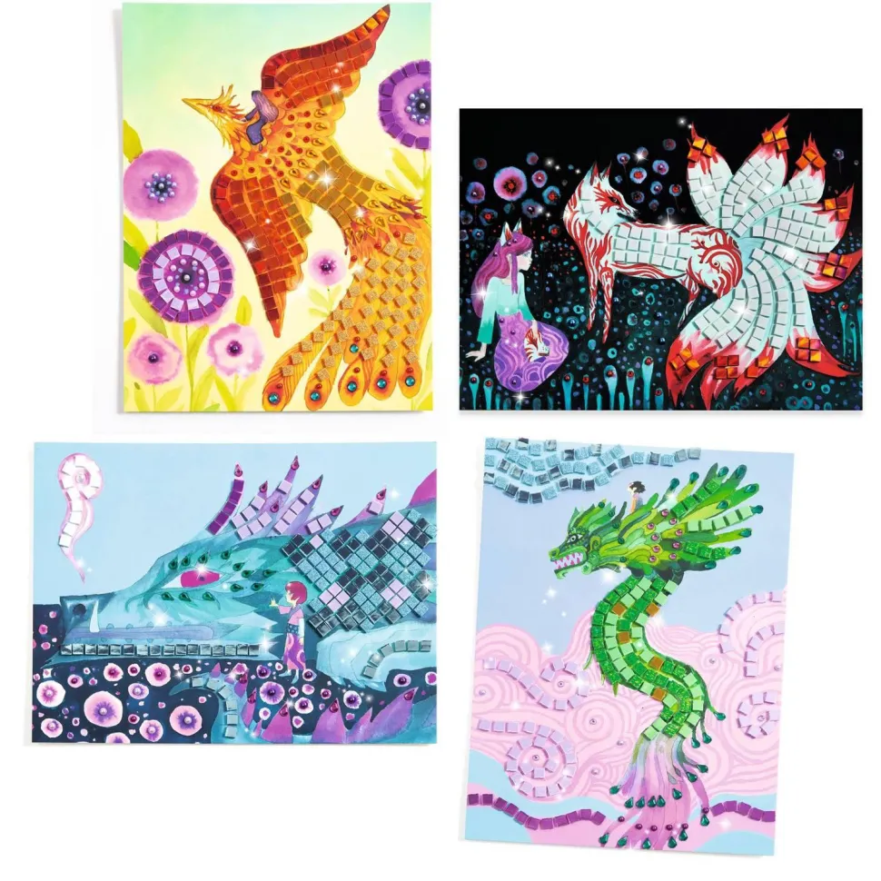 La marque Djeco présente Coffret mosaïque, Créatures légendaires ! Un coffret pour s’initier à l’art de la mosaïque. 4 tableaux à compléter avec de petits carrés de mousse pailletée et des strass qui s’utilisent comme des stickers. L’enfant repère les numéros, puis colle les pièces correspondantes à l’emplacement désigné sur la planche. Plumage ou pelage de feu, écailles d’émeraude ou de glace, l’enfant donne vie aux portraits de 4 créatures légendaires. Un produit en papier et carton certifié FSC®. Contenu : 4 cartes illustrées, 16 planches de carrés de mousse autocollants pailletés, 4 planches de strass adhésifs, 1 livret d?explications pas-à-pas en couleurs. A partir de 5 ans.