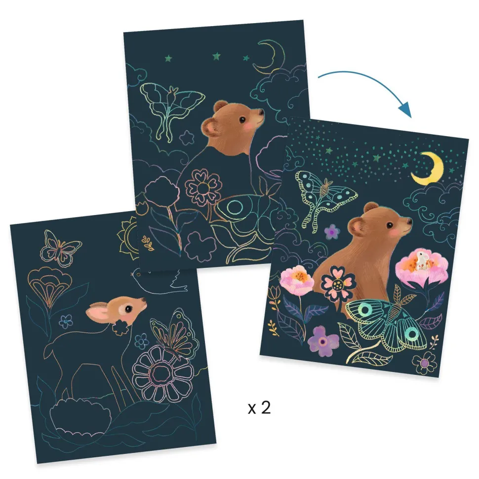 Cartes à gratter : 2 cartes à gratter avec effet métallisé + 1 stylet en bois.