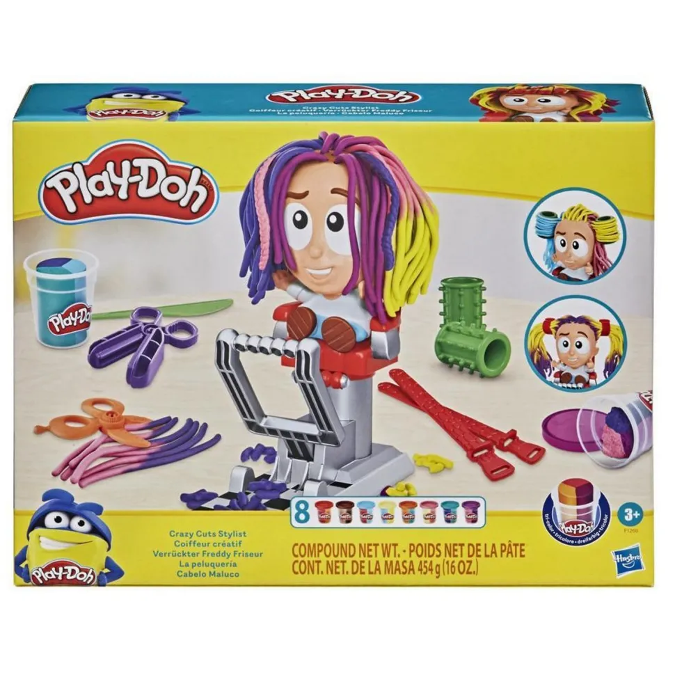 Tous les styles sont les bienvenus au salon de coiffure Play-Doh ! Ce salon de coiffure jouet pour enfants (à partir de 3 ans) permet de jouer au coiffeur de plusieurs façons et de donner au « client » une coiffure des plus extravagantes. On peut ajouter de la pâte à modeler à volonté pour avoir les cheveux les plus longs possible. On peut changer la forme et l’épaisseur des cheveux factices grâce aux différentes « têtes ». Les 8 pots de 56 g de pâte à modeler tricolore offrent une grande variété. Les enfants vont adorer utiliser les ciseaux Pour jouer et le rasoir factice pour couper encore et encore les cheveux du « client ». Inspiré du jouet classique Le coiffeur, ce coffret Play-Doh est le cadeau idéal pour un anniversaire, les fêtes ou toute autre occasion. Hasbro, Play-Doh et toutes les marques associées sont des marques de commerce de Hasbro.