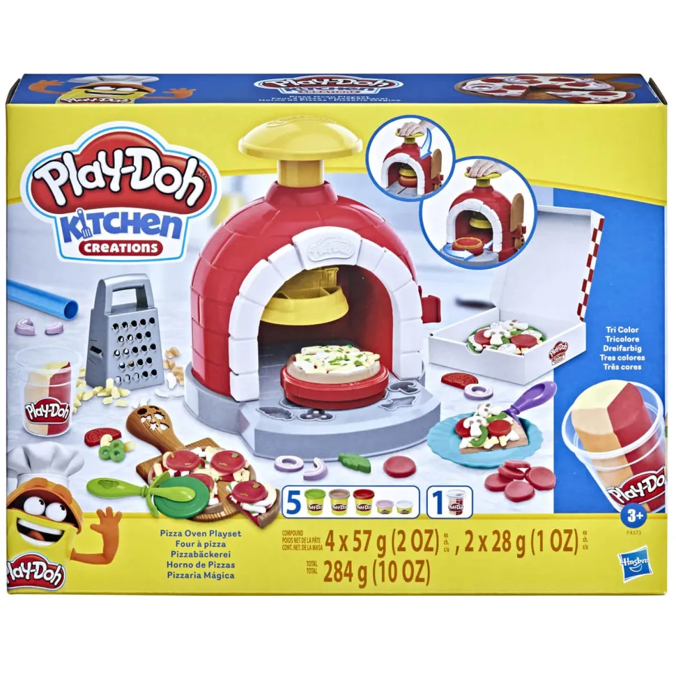 Contenu : four à pizza jouet, râpe à fromage, pelle à pizza, roulette à pizza, boîte à pizza, couvert, rouleau, 2 assiettes, 1 pot de pâte à modeler Play-Doh et 5 pots de pâte à modeler Play-Doh (poids net : 284 g).
