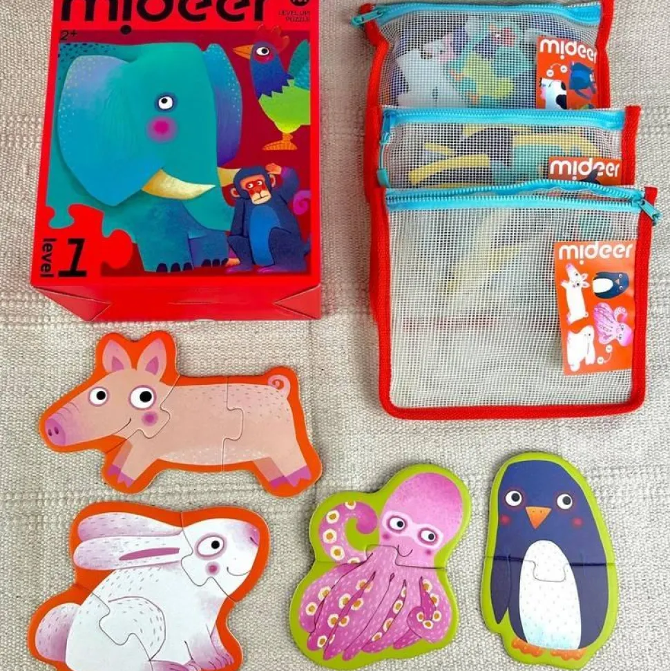 Coffret de Mideer avec 10 puzzles évolutifs en forme d’animaux, parfait dès 2 ans.