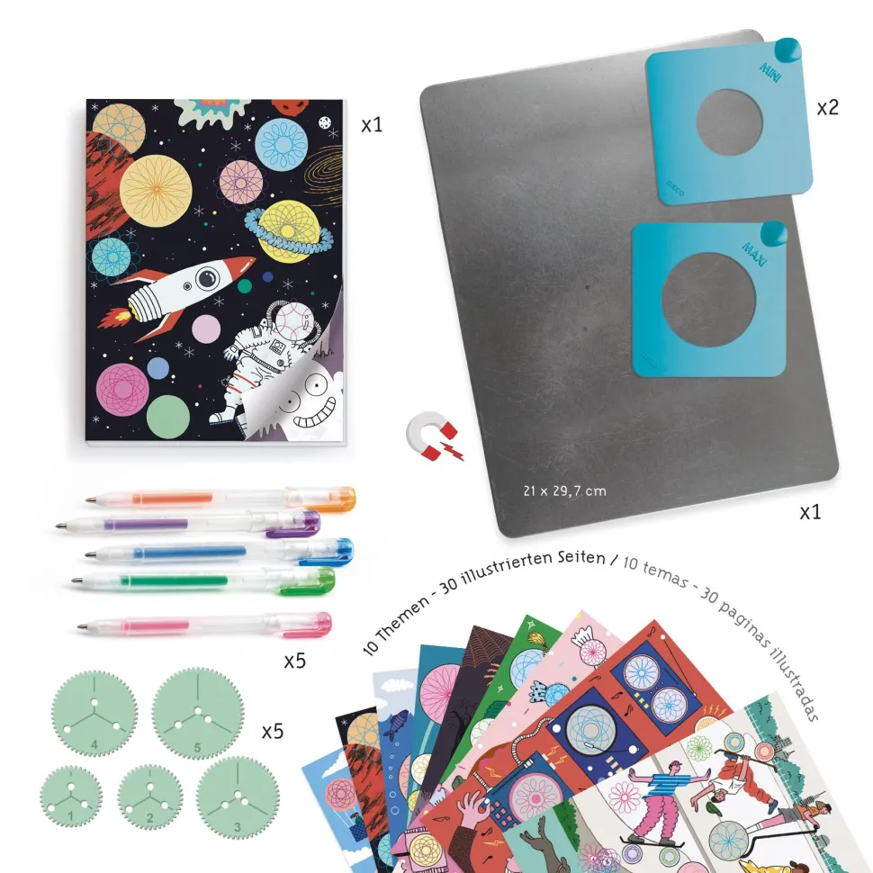 Dans ce coffret à dessins « Spirales », votre enfant sera libre de créer de superbe dessins à l’aide des 5 spirales. Le bloc de dessins fournis, fourmille d’idées de créations. Il est accompagné d’un dispositif aimanté astucieux permettant de dessiner les spirales sans bouger ! De quoi aider votre enfant à développer sa créativité et sa concentration.