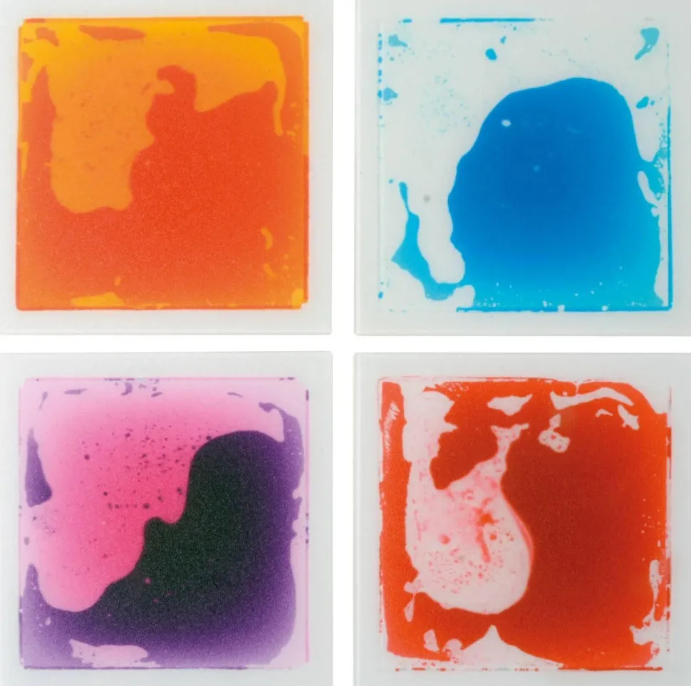 … Ces petits tampons fascination s’adaptent aux petites mains des enfants. Le liquide s’écoule selon la pression exercée. Ils sont suffisamment solides pour marcher dessus. Remplis de liquide cosmétique (non toxique), ils sont étanches et leur fond est antidérapant. La couche protectrice de 3,5 mm est résistante aux rayures. Charge maximale par tampon : 90 kg. Contenu : 4 tampons de couleurs : orange, bleu, violet et rouge. Poids par tampon : 275 g. Classe de protection incendie : EN13501-1: 2007 Bf1-S1.