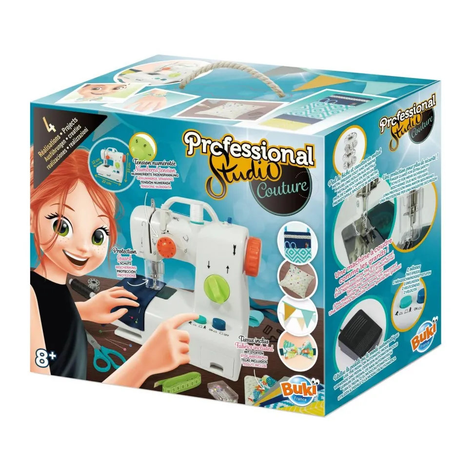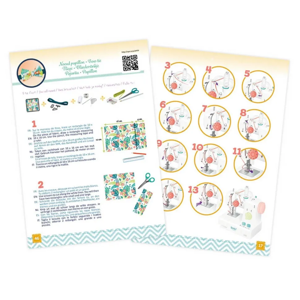 De nombreux accessoires dont des canettes en métal et des aiguilles de rechange pour la machine sont fournis. Les réalisations et les bases de la couture sont expliquées pas à pas dans une notice illustrée agrémentée de flashcodes pour accéder à des tutoriels vidéo !