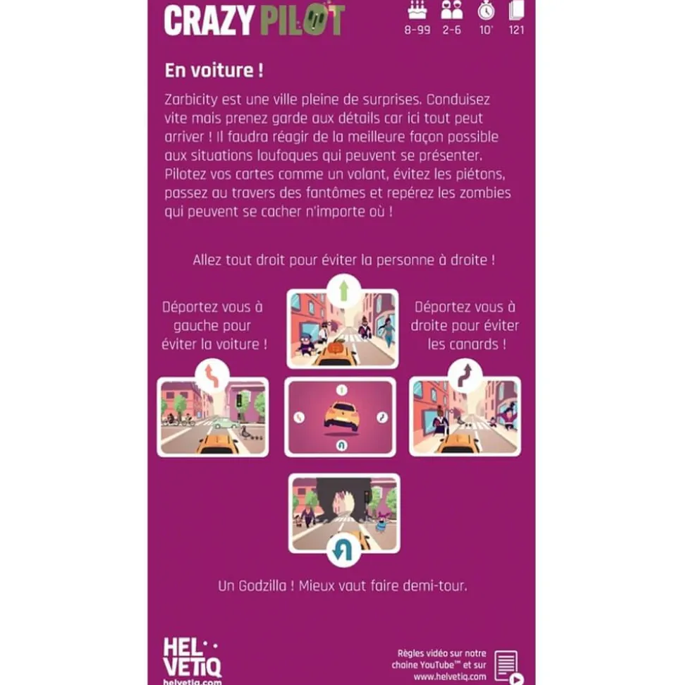 Mécanisme : Tiens tes cartes comme un volant et dirige-toi selon la situation de la carte. Tout droit, à gauche, à droite ou même demi-tour si la situation l’impose, mais fais-vite et méfie-toi des zombies qui ont envahi la ville !