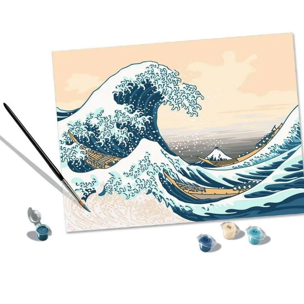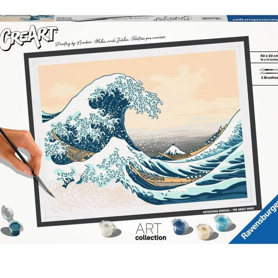 CreArt de la marque Ravensburger vous propose de la peinture par numéro pour adulte en grand format. Découvrez-vous une âme d’artiste en reproduisant ce célèbre tableau « The Great Vague » (la Grande Vague) de l’artiste Katsushika Hokusai.