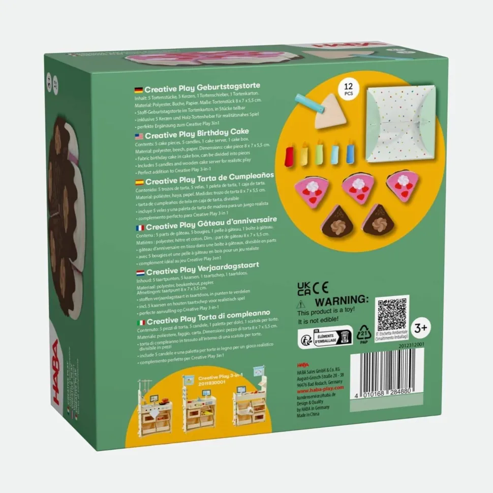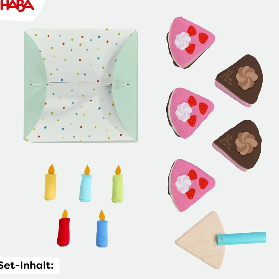 Gâteau en tissu soigneusement conçu dans une boîte à gâteau décorative. Divisible en morceaux grâce aux liens et peut être assemblé encore et encore. Les enfants célèbrent leurs propres anniversaires ou inventent de nouvelles situations de fête. Encourage l’imagination, le développement du langage et les compétences sociales. Développe la motricité fine : lors de la coupe, de l’assemblage et du service, les plus petits pratiquent leur coordination œil-main et leur dextérité de manière ludique. Ce jeu s’adapte parfaitement à la cuisine de jeu HABA.