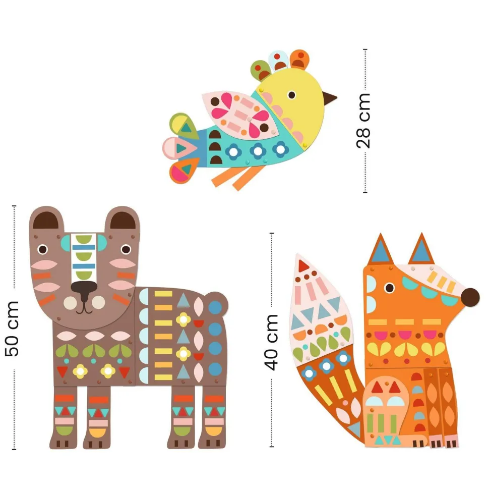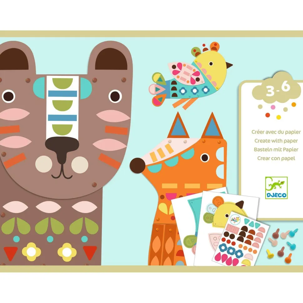 Découvrez la gamme de CREER AVEC DU PAPIER avec les 3 animaux géants de la marque Djeco. Un coffret de collage pour décorer et reconstituer trois grands personnages à mettre en couleur. En suivant les modèles du livret, l’enfant colle les autocollants pour compléter les animaux. Une fois terminé, il les assemble avec les attaches parisiennes pour reconstituer : l’ours (50 cm), le renard (40 cm) et l’oiseau (28 cm) ! Une activité de collage à partir de 3 ans. Plus de 200 grosses gommettes à coller. Les animaux sont très grands. Un livret explicatif en couleur et uniquement en image.