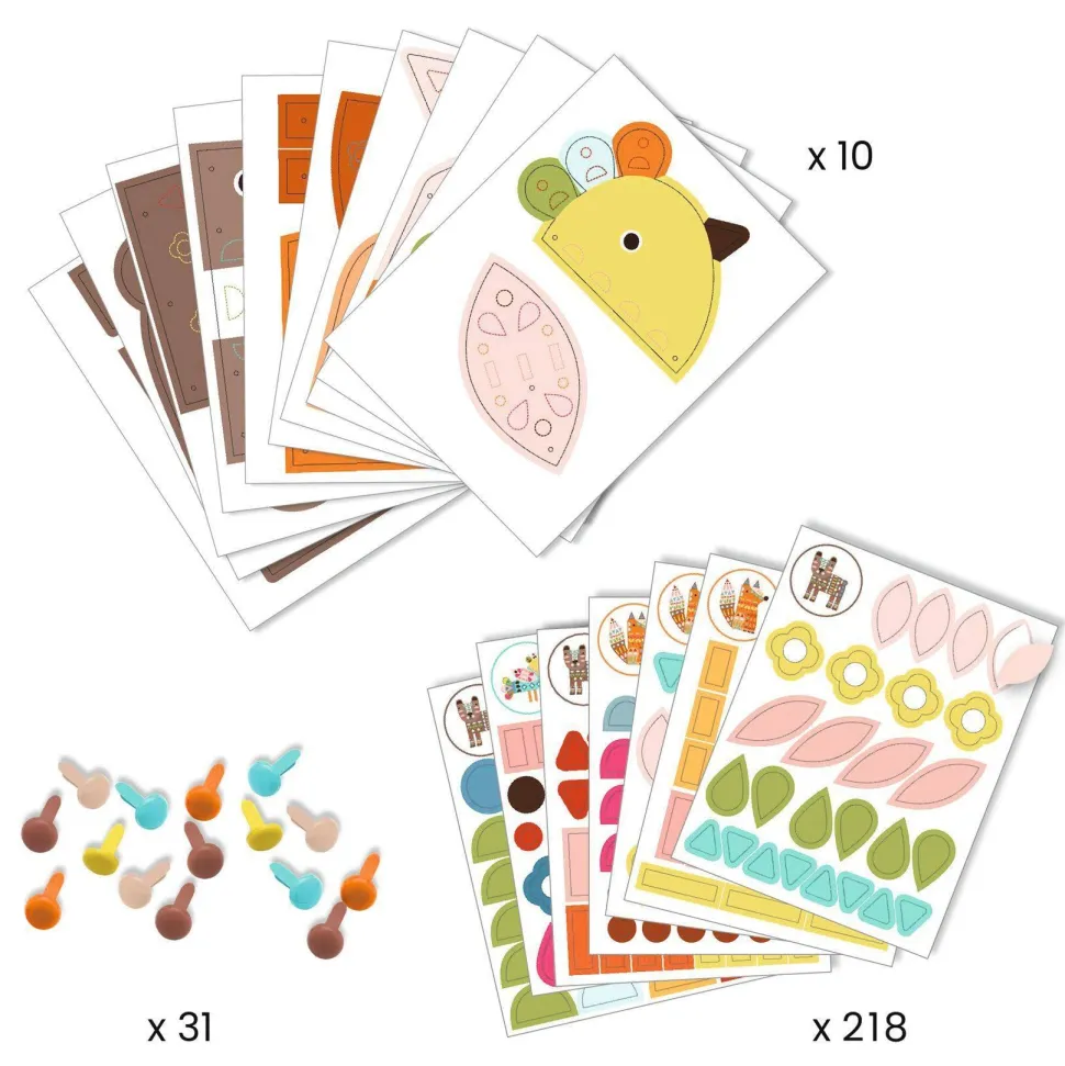 Contenu : 10 cartes prédécoupées à détacher, 218 autocollants, 31 attaches parisiennes de couleur et 1 livret explicatif pas-à-pas.