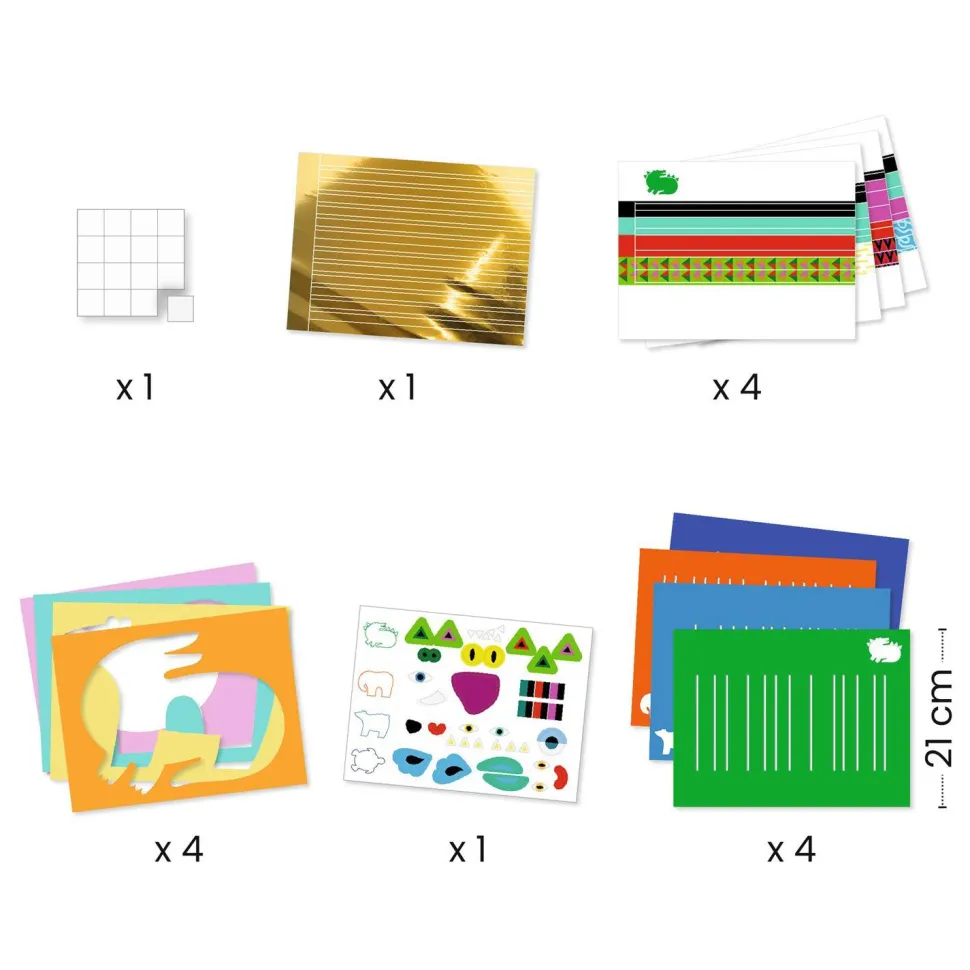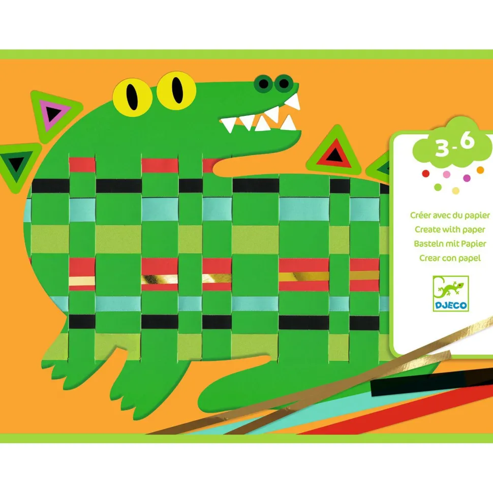 La marque Djeco présente Créer avec du papier, Devant-derrière- devant ! Pour chaque animal, l’enfant détache les bandes de papier et, en suivant le livret, il passe les bandes devant, derrière, devant… Il tisse. Il isole ensuite son tissage à l’aide d’un cache en forme d’animal et colle des stickers : et voilà un superbe tableau tissé ! Contenu: 4 fonds avec des rainures, pour tisser. 4 caches et des stickers double-face pour isoler le tissage. 4 feuilles prédécoupées, avec des bandes de papier pour tisser et une feuille dorée prédécoupée. Des gommettes pour embellir le tout. Un livret explicatif. Un produit en papier et carton certifié FSC®. A partir de 3 ans.