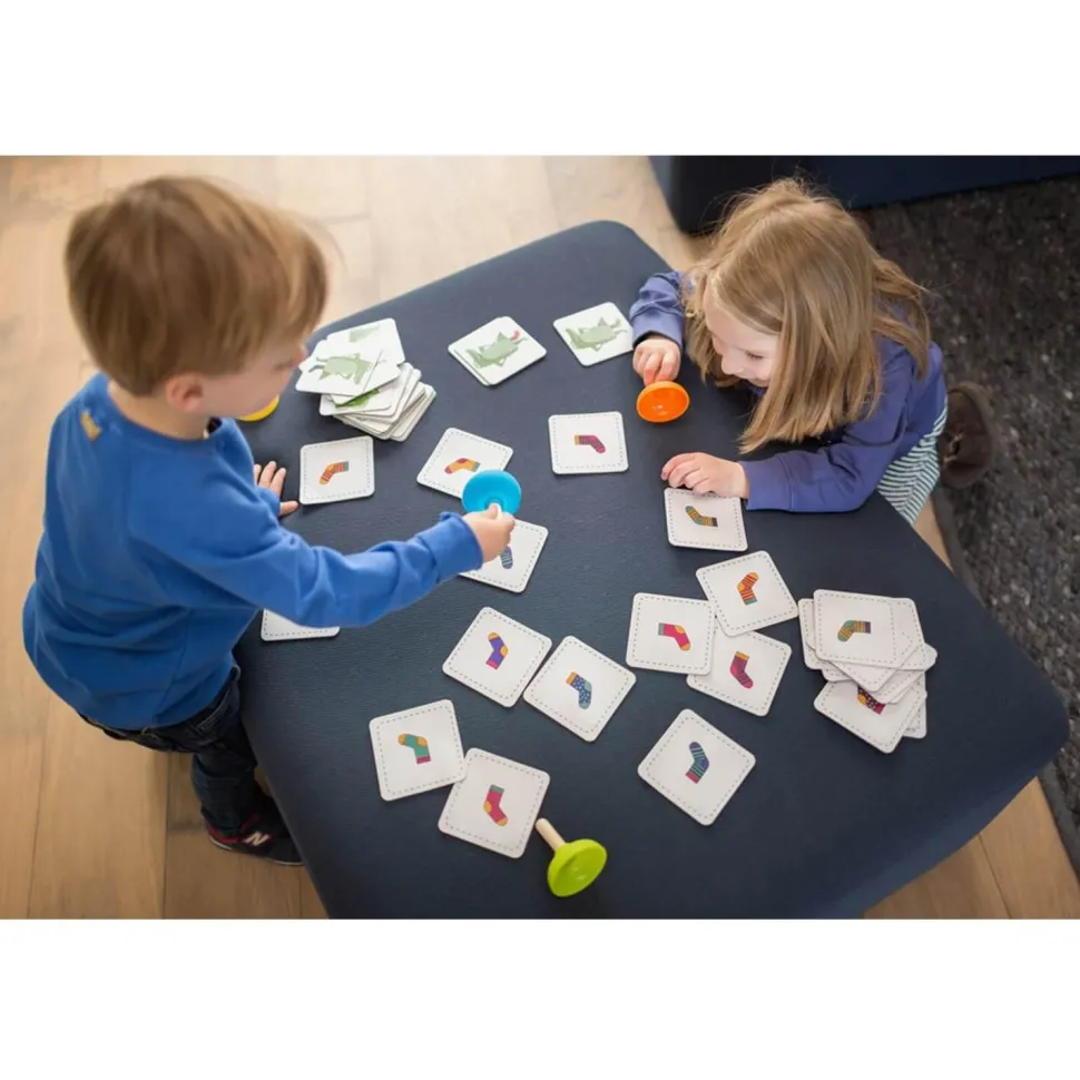 Oh oh… Le crocodile est un peu perdu ! Il cherche ses chaussettes mais il n’arrive pas à trouver de paire. Retournez une carte et attrapez la chaussette manquante en premier avec votre ventouse ! Mais attention, manque-t-il la chaussette droite ou la chaussette gauche ?