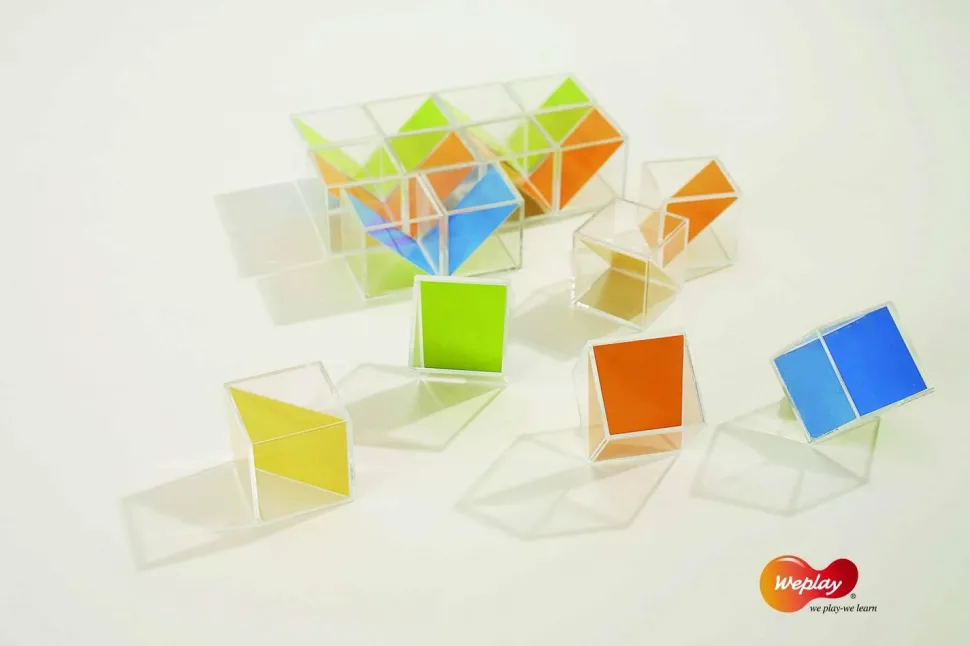 Les blocs transparents permettent aux enfants de se familiariser avec la structure de leurs créations. Grâce à l’effet visuel transparent de la Pyramide de Verre, les blocs sont dotés d’un papier cartonné bicolore (ton froid et ton chaud) placé en diagonale à l’intérieur, créant ainsi des perspectives visuelles uniques. Les blocs transparents permettent aux enfants de se familiariser avec les notions mathématiques de symétrie, de suite, de parallèle, de comparaison, etc., ainsi qu’avec l’espace réel et virtuel. Contenu : 8 blocs vert/bleu, 8 blocs jaune/orange, 6 cartes d’exemple imprimées recto verso, un guide pratique et une boîte de rangement en plastique. Matériau : ABS. Dimensions : 5 x 5 x 5 cm. Âge : à partir de 3 ans.