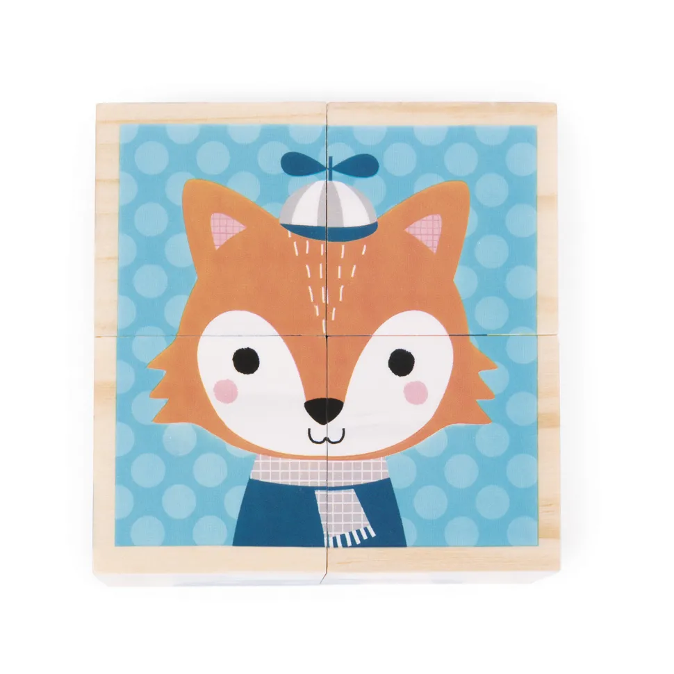 4 cubes en bois pour former 6 beaux portraits d’animaux ! Ce jeu de construction pensé pour les enfants de 1 à 3 ans repose sur 4 cubes en bois massif, illustrés sur chaque face. En les assemblant correctement, on peut ainsi reconstituer les portraits de six adorables animaux portant chemises, écharpes, cravates et chapeaux : un renard, un ours, un lapin, un chien, un chat et un cerf. Grâce à ces cubes, l’enfant va pouvoir travailler sa coordination, sa mémoire visuelle et son sens de l’observation, tout en enrichissant son vocabulaire et sa connaissance du monde. Dimensions des cubes : 4.5 x 4.5 x 4.5 cm. Dimensions de la boîte : 20 x 10 x 5 cm. Note : retrouvez d’autres quatuors de cubes en bois sous les référence Janod-J08001 et Janod-J08002.