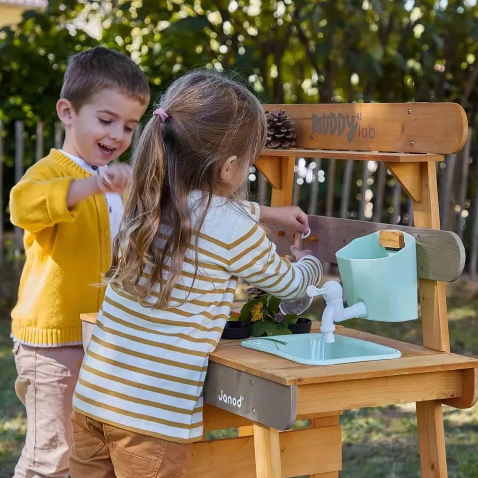 Ce véritable laboratoire de découverte de la nature est parfaitement équipé pour satisfaire tous les aventuriers des jardins grâce à ses 2 éviers et 2 petits pots amovibles en plastique permettant de partir à la recherche d’ingrédients de potions secrètes ! Un vrai robinet permet de passer au nettoyage facilement : il suffit de le remplir le bac puis d’ouvrir le robinet de droite à gauche pour laisser l’eau s’écouler ! Pour faciliter les recherches de votre petit explorateur, un tamis en métal et un pinceau sont également mis à sa disposition.