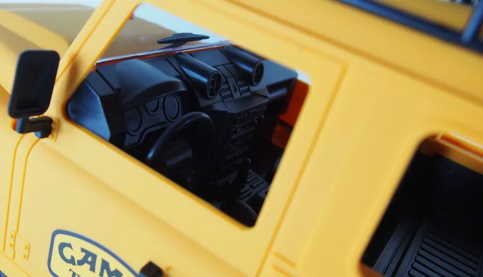 Camel Trophy reloaded – reproduction sous licence du légendaire véhicule tout-terrain Landrover D-90 dans une magnifique optique Scale avec un éclairage LED complet, y compris les clignotants, qui convainc lors de l’utilisation offroad à l’échelle 1:12 : le modèle allie de bonnes caractéristiques de conduite à une technique formidable et à une optique géniale. Même les plus petits détails sont fidèles à l’original. Toutes les pièces rapportées comme les essuie-glaces, les caches d’éclairage, les rétroviseurs ou les prises d’air sont fournies. Toutes les pièces sont enfichées et ne doivent pas être collées. Une galerie de toit est déjà montée et offre de la place pour ses propres idées, comme par exemple une boîte à outils optionnelle, des roues de rechange ou autres. Tous les fans de l’échelle y trouveront leur compte. Le capot peut être ouvert à la main : En dessous se trouve un compartiment pour la grande batterie Li-Ion 7,4V 1200mAh. La peinture de haute qualité de la carrosserie solide en ABS et le cadre métallique (châssis) complètent l’ensemble.
