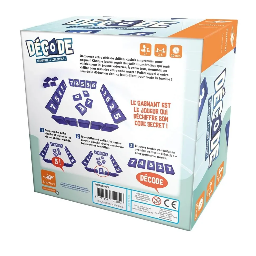 DECODE est un jeu de logique et de déduction simple et très rapide à assimiler ! Chaque joueur reçoit une série de tuiles numérotées de 1 à 7, parmi les vingt-huit disponibles. Il ne peut voir que celles révélées au centre de la table et celles des autres joueurs. À son tour, il faut appeler un numéro qu’on pense avoir dans sa suite, pour être le premier à la décoder !