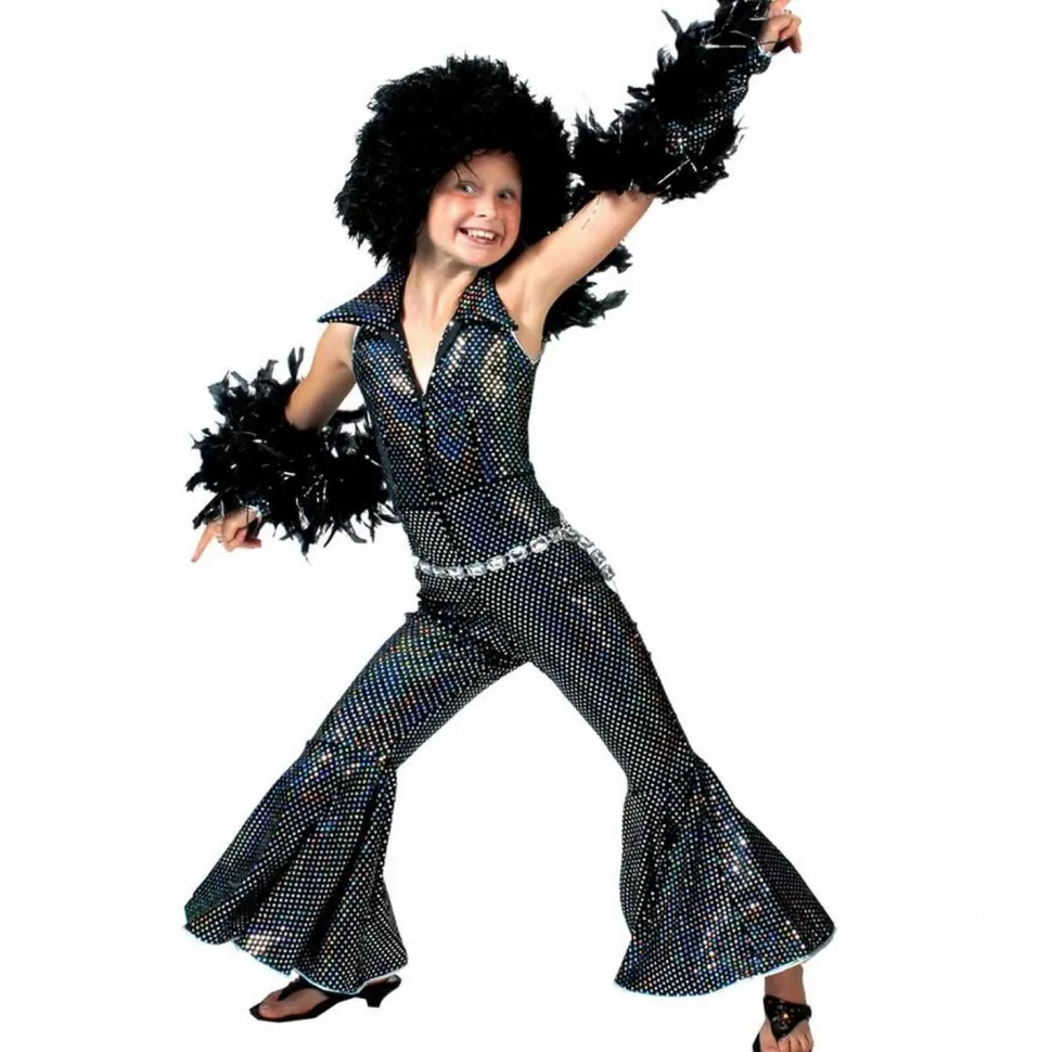 Ce déguisement se compose d’une combinaison et de manchettes assorties. Le tissu est noir avec des effets à pois holographiques pour un côté ultra lumineux sur la piste de danse ! La combinaison est sans manches avec un grand col. Le bas est coupé en pantalon patte d’éléphant.
