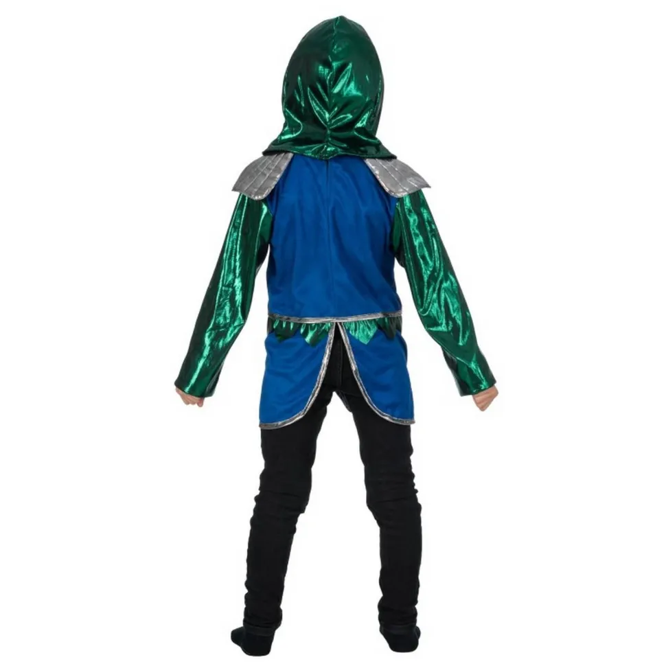 Le déguisement possède des détails argentés et vert métallisé. Pour venir compléter la tenue, un camail vert métallisé symbole du chevalier est inclus.