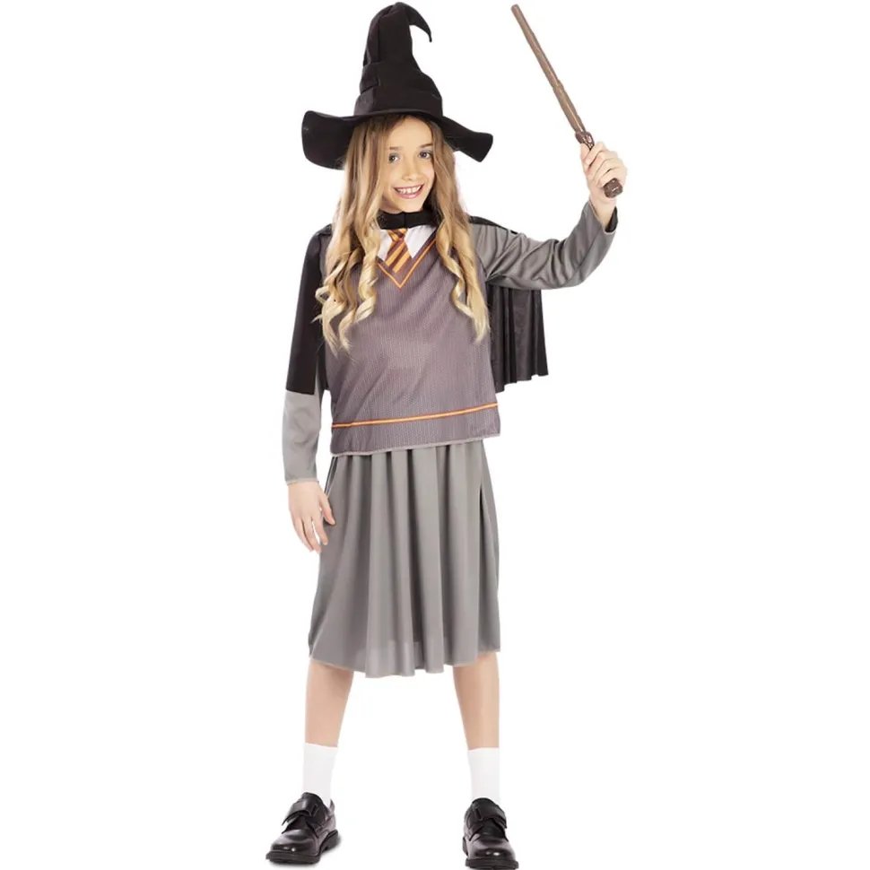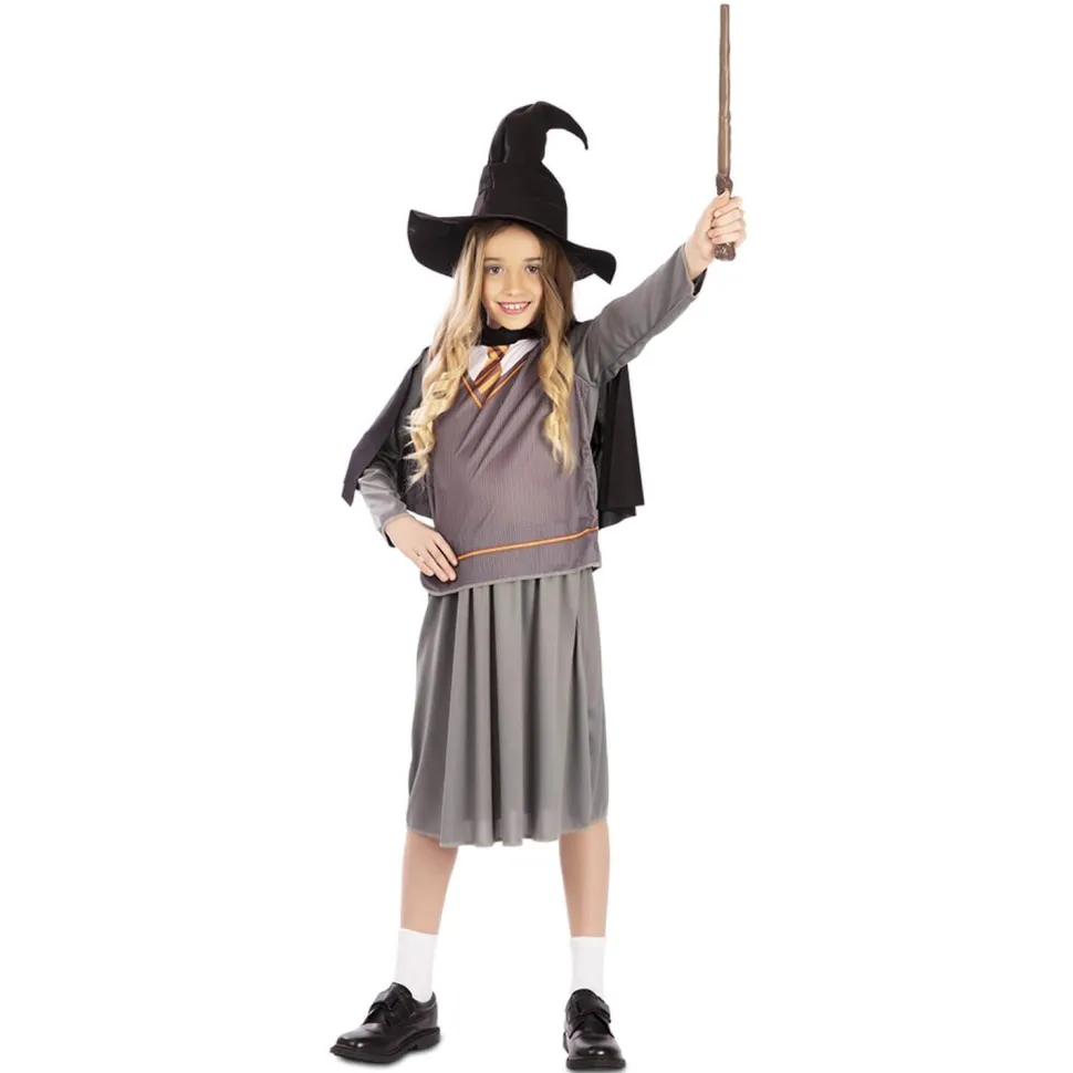 Ce déguisement se compose d’une jupe grise et d’une chemise imprimée d’un faux gilet gris et d’une fausse cravate rouge et jaune. Celle-ci est surmontée d’une cape noire sur les épaules. Enfin, cet ensemble est complété d’un chapeau pointu noir.