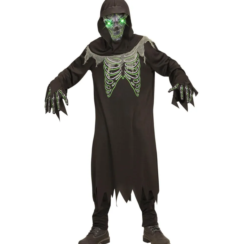 Ce déguisement se compose d’une grande tunique noire à manches longues. La tunique ne va pas jusqu’aux pieds et possède un effet déchiré sur le bas et au niveau des poignets. Il y a sur le buste un dessin d’os de cage thoracique blancs et verts. Des gants noirs avec des dessins d’os blancs et verts sont inclus avec le déguisement. Un masque qui s’enfile comme une cagoule vient également avec la tenue. Il est noir avec des détails de tissu gris déchiré. Il y a un visage de crâne de squelette gris et vert. La particularité de ce costume réside dans les yeux lumineux verts. Les yeux clignotent et fonctionnent à l’aide de 2 piles AAA incluses.