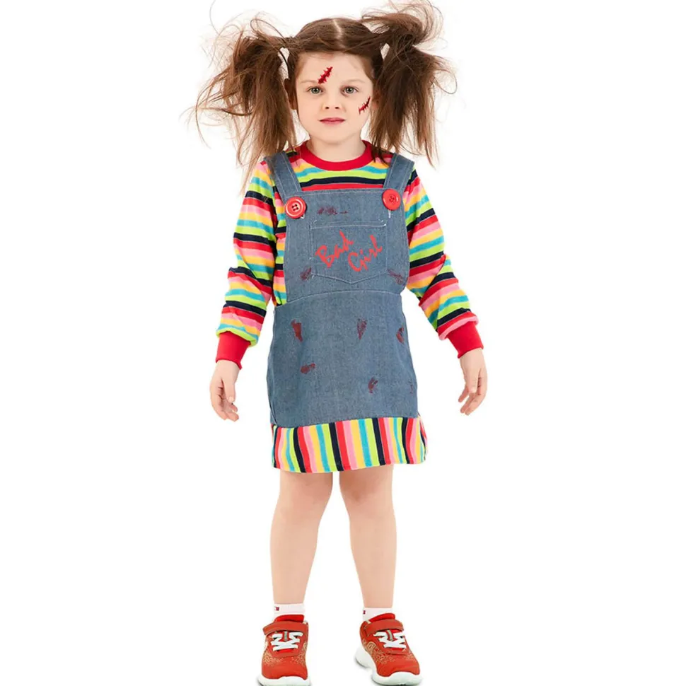 Votre fille pourra incarner un étrange personnage d’enfant possédé grâce à ce déguisement composé d’une robe salopette courte de couleur jean avec des tâches de sang et l’inscription « bad girl » sur le devant et d’un sweat à rayures de couleur.