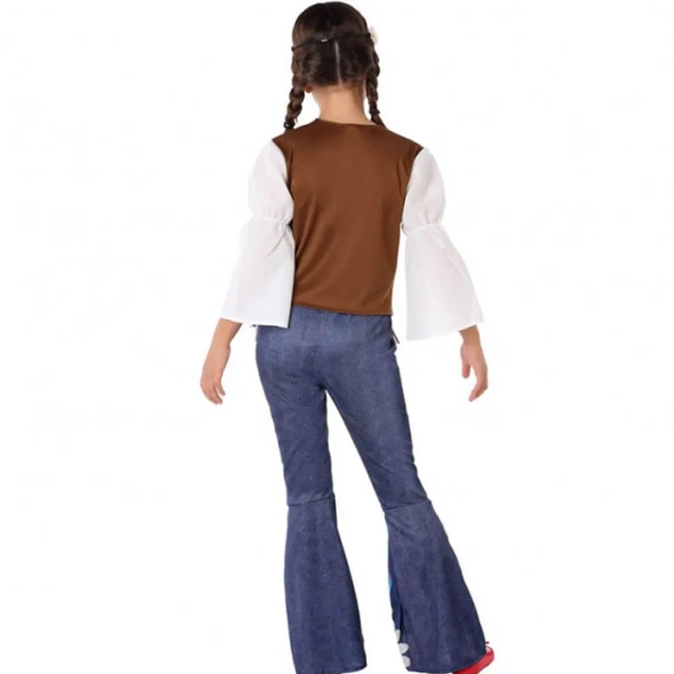 Un superbe look Peace and Love pour découvrir les années 70 ! Ce déguisement de hippie pour fille se compose d’une tunique et d’un pantalon.Cet ensemble rappelle complètement le style vestimentaire des années 70. Le pantalon couleur denim pattes d’eph est imprimé de motifs de fleurs, d’étoile et de coeur dans le bas. La tunique, quant à elle, en tissu blanc possède des manches longues et évasées et est surmontée d’un faux gilet sans manches marron à franges. Avec ce déguisement, votre enfant fera sensation à l’occasion des fêtes déguisées, notamment lors du Carnaval… Complétez-le à l’aide de plusieurs accessoires hippies comme par exemple un bandeau, des accessoires à fleurs, des lunettes rondes …