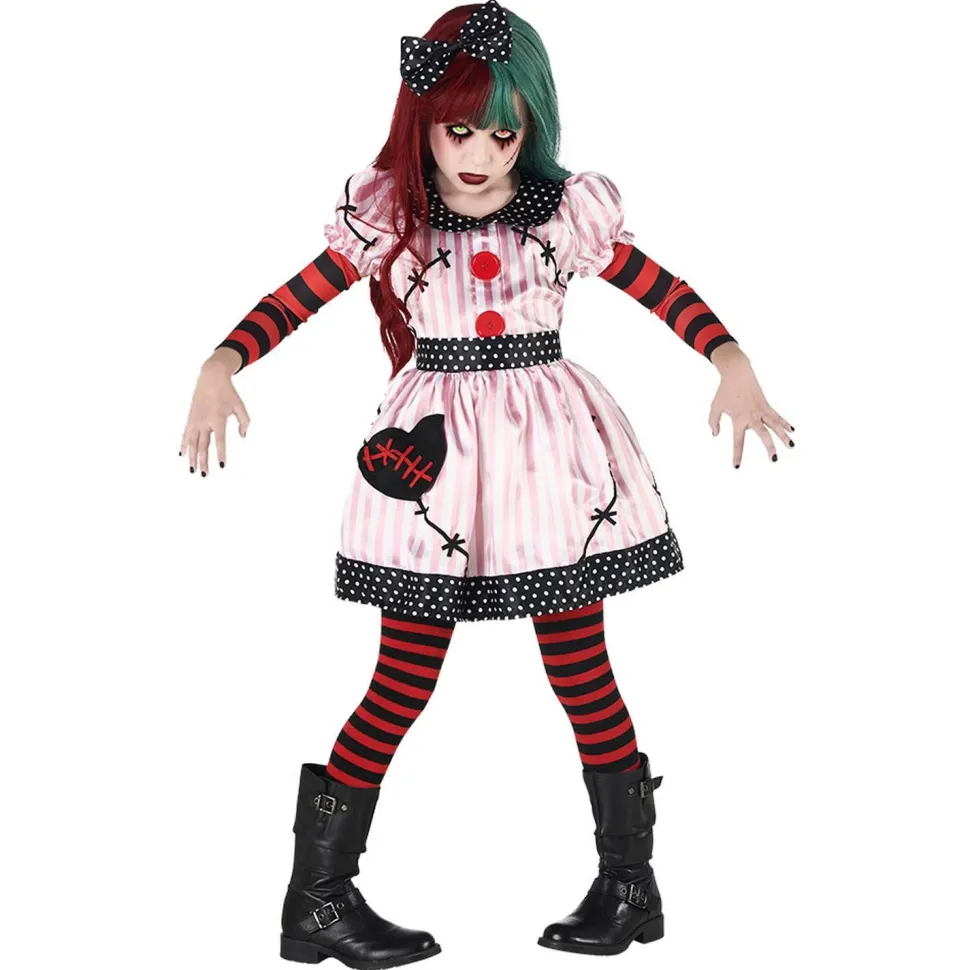 Ce superbe déguisement de poupée diabolique comprend un serre-tête avec un gros nœud noir à pois blanc. La robe est rayée rose et blanche avec 2 boutons rouges et des décorations type points de couture ainsi qu’un cœur noir et rouge. Les manches sont courtes et bouffantes. Le col, le bas de la robe et la ceinture sont noirs à pois blancs. Les manchettes ainsi que le collant sont rayés rouge et noir.