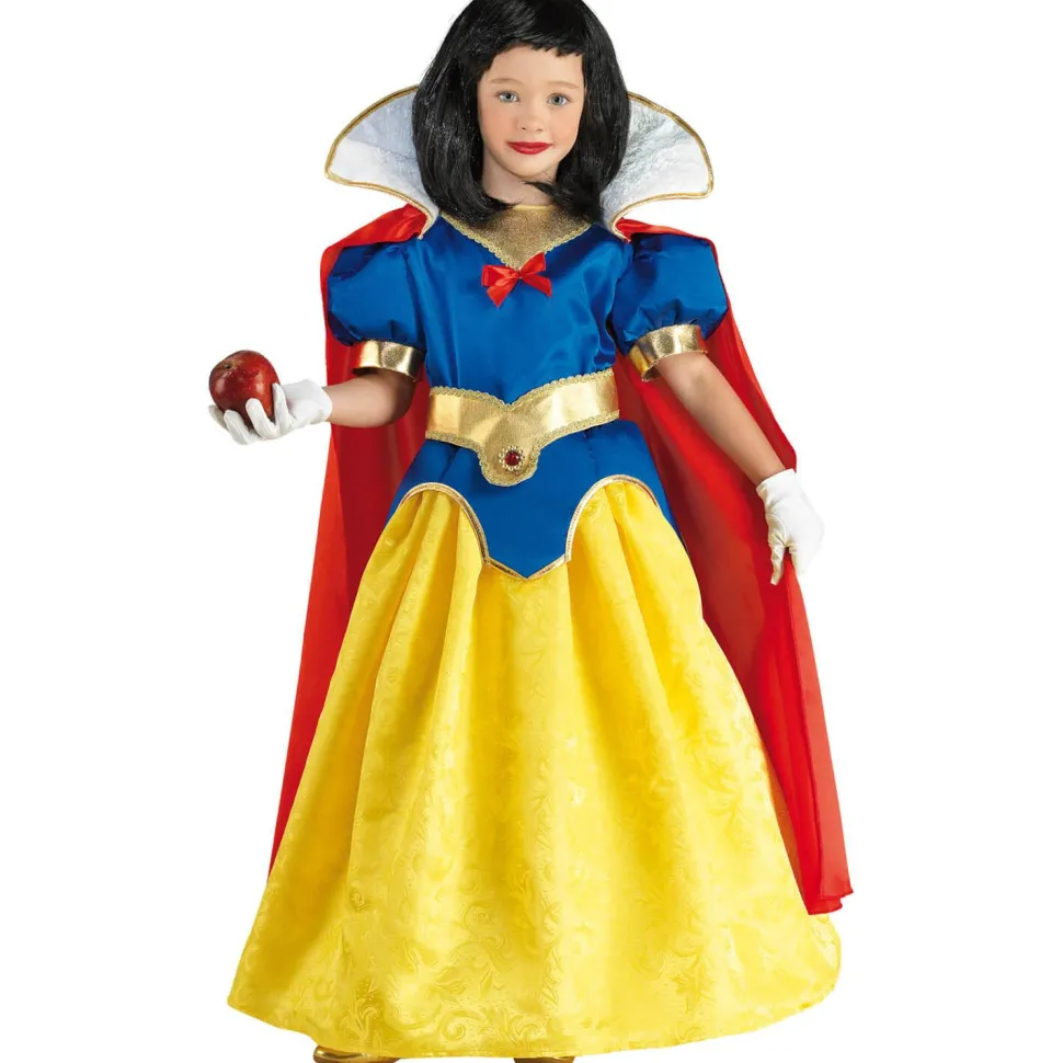 Ce déguisement comprend une robe à la jupe jaune, et au bustier bleu avec manches ballon bleu et ceinture dorée, accompagnée d’une longue cape rouge avec un large col blanc.