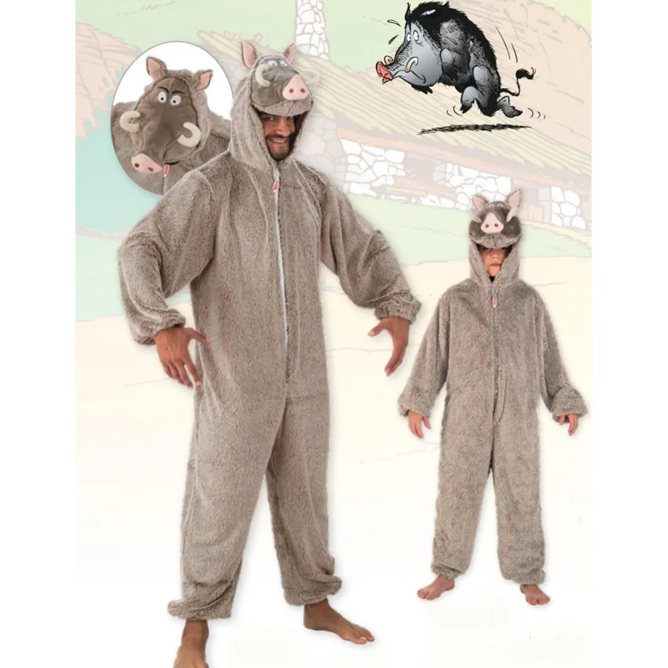 Déguisement du Sanglier dans Astérix ® le gaulois, repas préféré d’Obélix, comprenant la combinaison peluche intégrale avec tête de sanglier