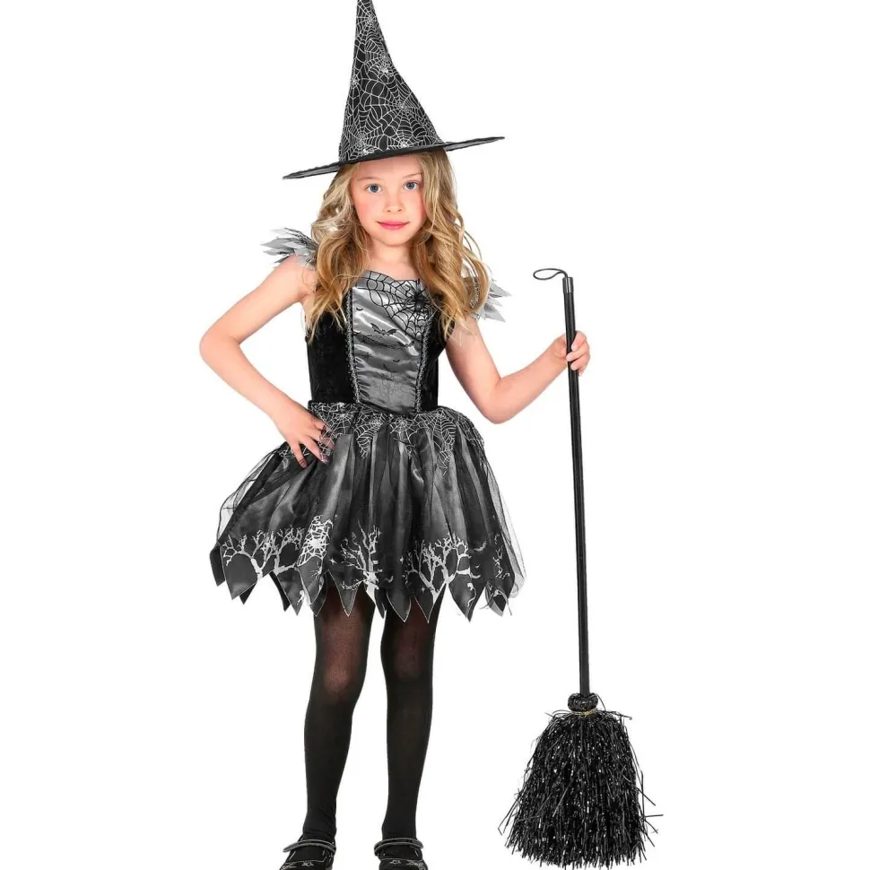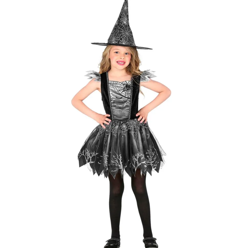 Ce déguisement contient une robe noire et argentée. Le jupon est noir et coupé en pointe sur le bas pour un effet déchiré. Il présente des détails argenté avec des dessins de toiles d’araignées et d’arbre sans feuilles. Le bustier est noir avec un empiècement argenté au milieu. Il y a les mêmes motifs que sur le jupon en noir. Le bustier est sans manches avec des détails de tissus sur les épaules. Un chapeau noir est inclus avec le déguisement. Il est haut et pointu avec des dessins de toiles d’araignées.