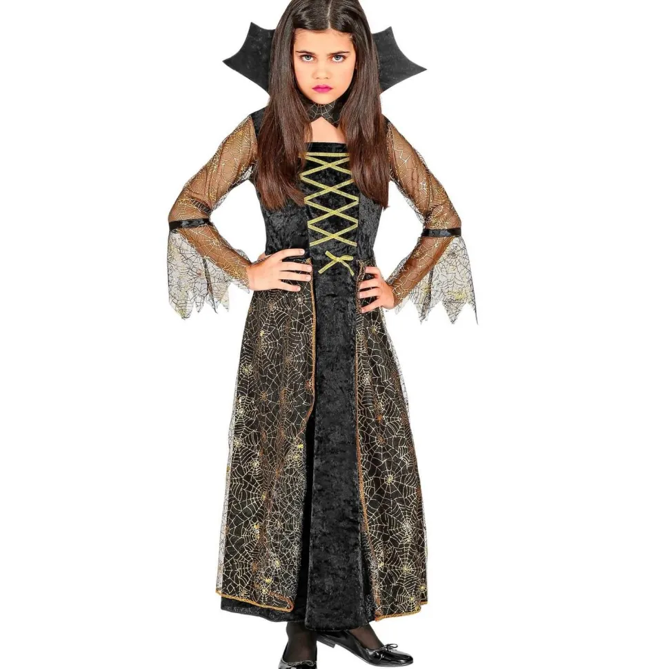 Le déguisement se compose d’une longue robe noire effet velours. Le bustier de la robe à un effet corsage doré. Il y a un tissu transparent avec des toiles d’araignée dorées sur le jupon. Les manches longues sont évasées et sont dans le même tissu que le jupon. La robe possède une collerette haute noire. Un collier noir avec des toiles d’araignée dorées est inclus.