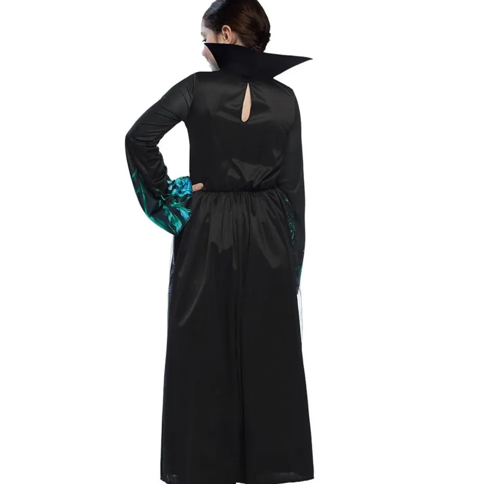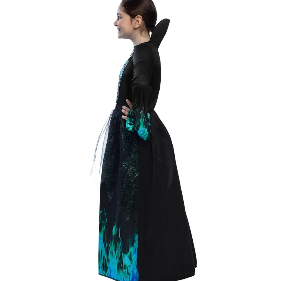 Ce déguisement est une robe noir et bleu/vert. La robe est à manches longues. Elle a un motif de squelette bleu/vert au niveau des manches et du buste. Il y a un dessin de flammes bleu/vert sur le bas de la robe et au niveau des poignets. On retrouve des paillettes de mêmes couleurs sur un jupon noir transparent avec un effet déchiré. La robe possède un grand col noir intégré.