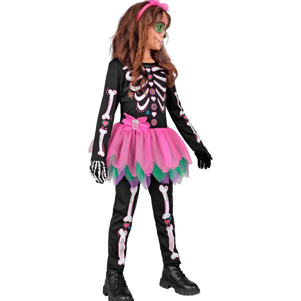 Avec son imprimé d’os stylisés en rose et blanc sur fond noir, agrémenté de motifs fleuris façon Dia de los Muertos, ce costume sort du lot. Le haut et le pantalon assortis forment la base du squelette, tandis que la jupe en tulle multicolore apporte une touche fun et festive. Les gants squelette complètent l’ensemble pour un effet ossement garanti, et le serre-tête à fleur vient couronner le tout avec une pointe de magie mexicaine.