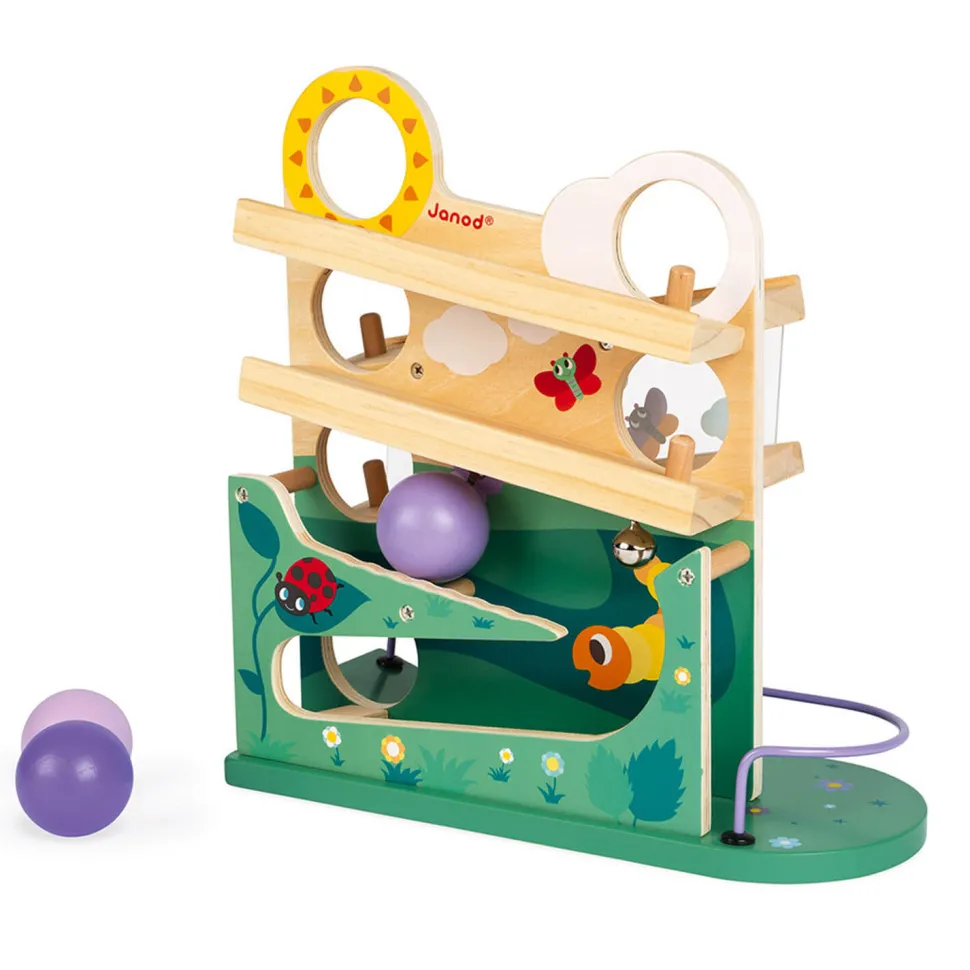 Un jeu tout en bois au décor coloré parfait pour l’éveil des tout-petits à partir de 12 mois et qui garantit des heures d’amusement ! Ce joli descendeur en bois est équipé de 3 balles qui passent dans le soleil et les nuages puis dans le tunnel transparent. Au passage, elle font tinter la clochette puis atterrissent dans le jardin en formant une chenille. Les enfants vont adorer regarder les balles descendre à toute allure le long du parcours !Une activité idéale pour développer la dextérité (placement des billes) et l’acuité visuelle (suivi du mouvement) de l’enfant.Dimensions du jouet : 28,6 x 12 x 30,5 cm.