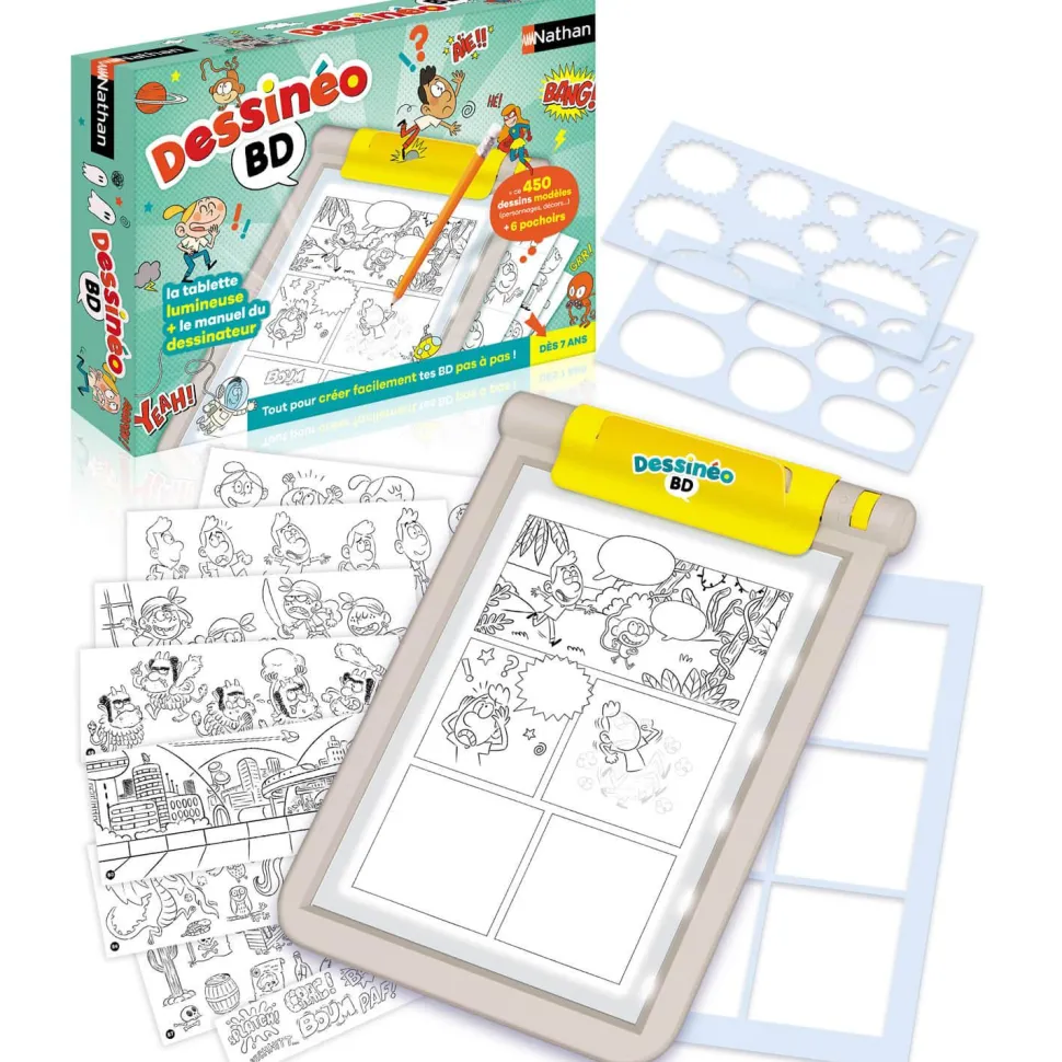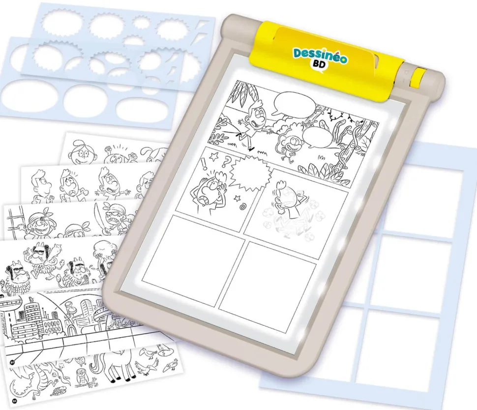 Une tablette lumineuse et un matériel très complet pour s’initier pas à pas à la création de bande dessinée. L’enfant pourra choisir un univers parmi les 4 proposés (Moyen-Âge, quotidien, aventure et futur), écrire un scénario, découper une planche en cases, dessiner les personnages, les bulles et le décor…