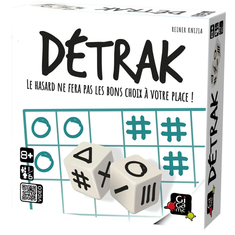 Découvrez Détrak un jeu de dés original sans aucun temps mort, compris en 2 minutes et où chaque tour est décisif !Ce jeu d’ambiance avec des dés adapté à partir de 8 ans sera parfait pour jouer en famille (de 1 à 6 joueurs).Le principe :Lancez les dés et notez les symboles obtenus dans votre grille pour marquer le plus possible de points.Pour gagner, il faudra garder un oeil sur toutes les lignes et toutes les colonnes, et tenter de créer des suites de 2, 3, 4 ou même 5 symboles identiques.Des règles avancées sont incluses pour les joueurs en quête de nouveaux défis.Contenu de la boîte :- 2 dés spéciaux, – 6 crayons,- 1 bloc de score,- 1 règle du jeuDurée minimum de jeu : 10 min.Dimensions de la boite : H11 x L11 x P3,5 cm.