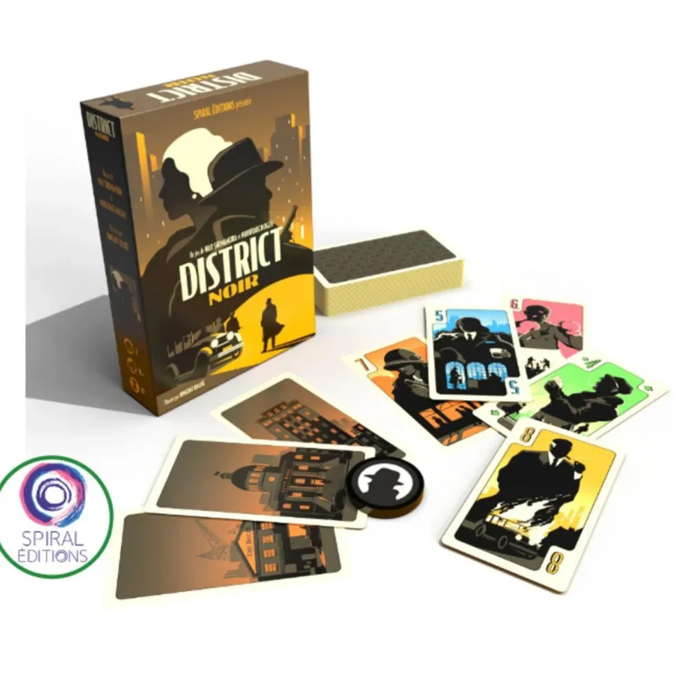 Dans ce jeu District Noir Spirale Éditions, vous devez allier de la prise de risque et du bluff. En plus de faire les bons choix il faudra aussi essayer d’amener son adversaire à en faire de mauvais. Pour cela, à l’issue des 4 manches, il faut marquer plus de points que votre adversaire. Vous pouvez également l’emporter immédiatement en contrôlant les trois cartes Ville (qui représentent les lieux stratégiques de la ville).