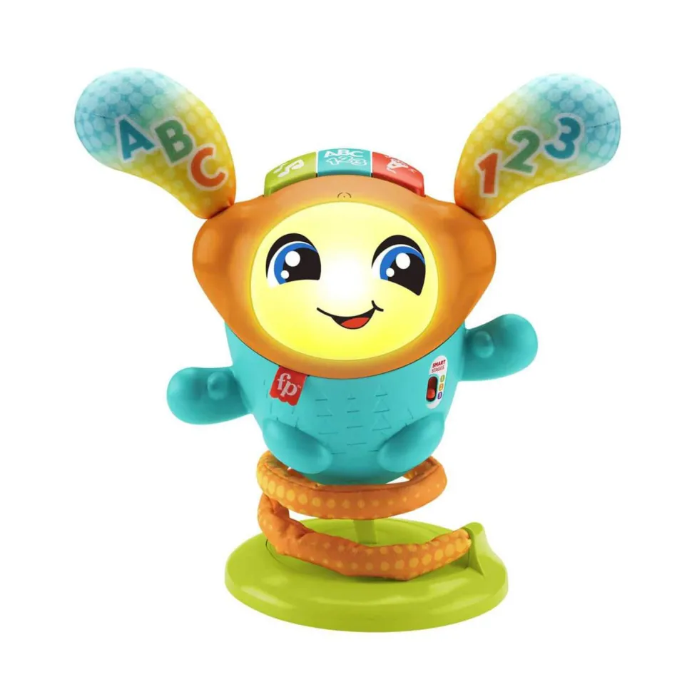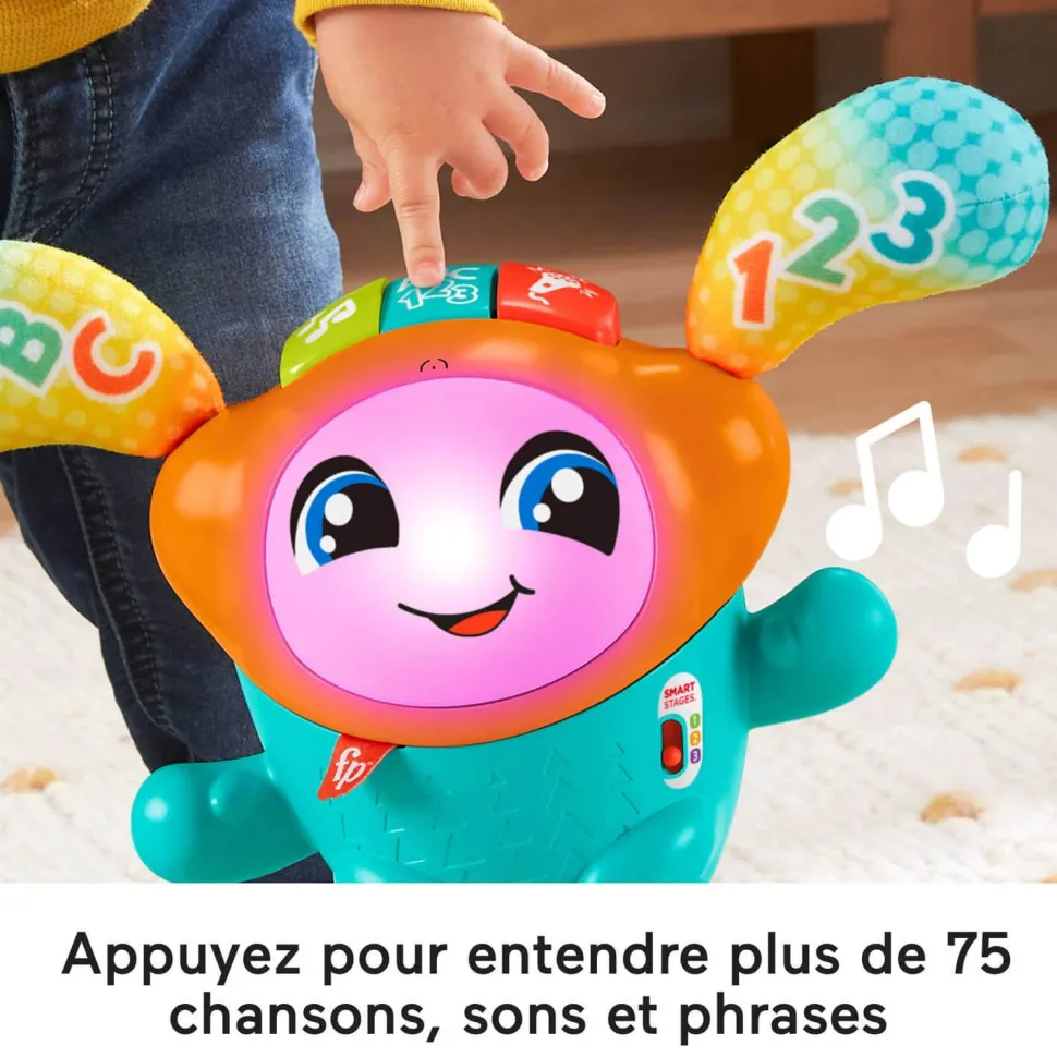 3 niveaux d’apprentissage Éveil Progressif pour apprendre l’alphabet, les couleurs, à compter de 1 à 10 et les opposés. Insufflez un esprit de fête dans la chambre de bébé avec Mon Petit DJ, un jouet d’éveil musical de Fisher-Price. Quand bébé appuie sur les boutons, le compagnon de danse interactif se met à sautiller. Ses mouvements sont accompagnés de lumières colorées et de plus de 75 chansons, sons et phrases pour apprendre à l’enfant l’alphabet, les chiffres, les couleurs et plus encore.