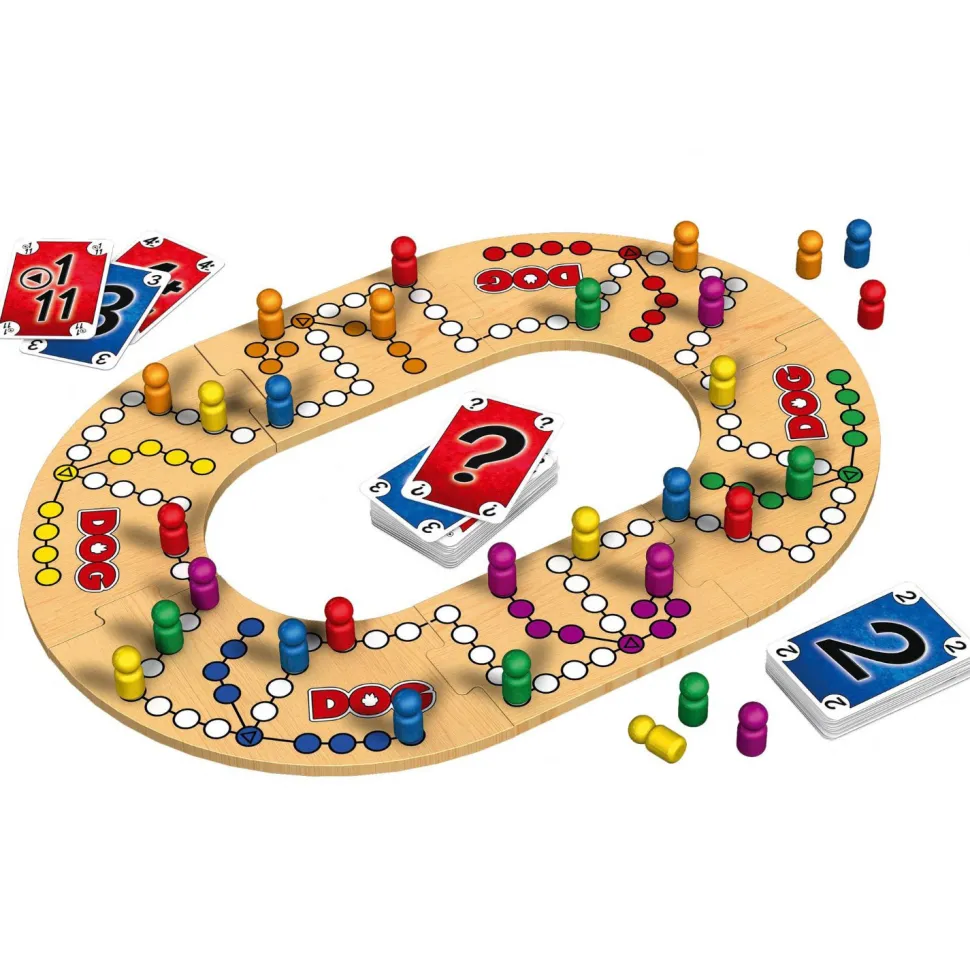 Laissez-vous séduire par ce jeu génial ! Le jeu Dog mais tout en bois (pions et plateau) dont la planche qui sert de plateau de jeu est variable.On dirait le jeu de petits chevaux mais c’est Dog Deluxe ! On déplace les pions à l’aide de cartes pour atteindre l’arrivée, ce qui occasionne beaucoup de surprises.Il s’agit alors d’échanger les bonnes cartes avec son partenaire et d’essayer de deviner sa stratégie. Car ce n’est qu’ensemble que l’on peut gagner. Mais la victoire en équipe doublera le plaisir ! Stratégie, chance et interaction.Durée moyenne d’une partie : 30 à 45 min.Contenu :- 110 cartes- 30 pions en bois- 1 planche de jeu en bois découpée en 6 parties- Règles.Nombre de joueurs : 2 à 6.Dimensions : 22.5 x 31 x 7 cm.