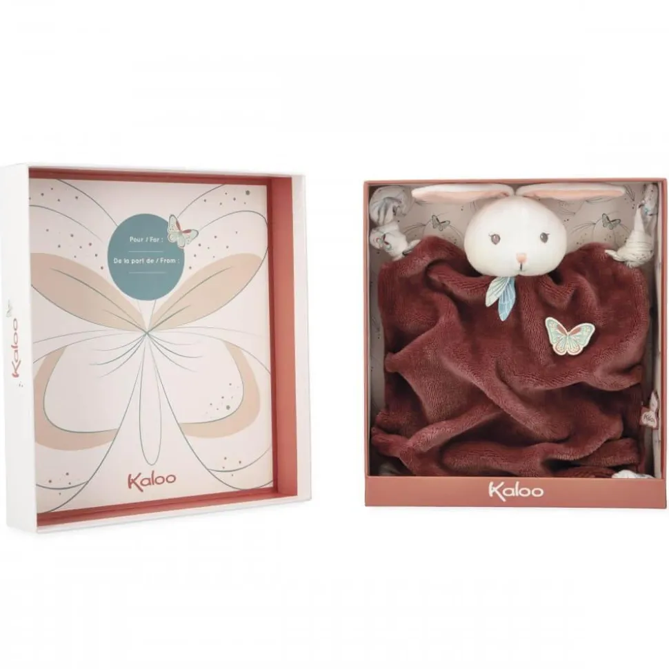 D’un beau coloris Cannelle, ce doudou carré comporte 4 nœuds à manipuler par l’enfant, qui sont aussi très utiles pour y accrocher la tétine et ainsi la garder à proximité. Le petit minois du lapinou et les motifs poétiques imprimés de papillons font de ce doudou Kaloo un compagnon rassurant pour bébé. Il arbore également de petites plumes au niveau de son cou et un papillon en relief brodé, comme posé sur son cœur. D’une intense douceur, le corps de ce doudou 4 nœuds a de nombreux plis et de longues oreilles qu’on ne se lasse pas de sentir glisser sous ses doigts.