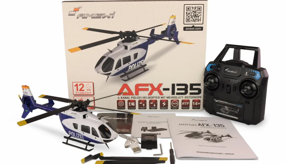 Reproduction Super Scale d’un célèbre hélicoptère peint aux couleurs de la police allemande – l’AFX-135 présente de nombreux détails qui correspondent entièrement à l’original. Même les différents rivets de la cabine, qui est fabriquée en plastique massif, sont représentés. Cet hélicoptère à l’échelle dispose d’un éclairage LED à l’avant et à l’arrière, ce qui complète son aspect séduisant. Grâce à l’électronique de haute qualité, y compris le décollage et l’atterrissage automatiques, le comportement en vol est bon et l’hélicoptère est adapté aux débutants malgré la tête de rotor multipale. Le temps de vol est d’environ 7 à 9 minutes avec la batterie intelligente intégrée. L’astuce particulière est qu’une prise de charge USB est intégrée dans l’accu et qu’il suffit de la raccorder au câble USB fourni. L’accu et le modèle disposent d’une fonction de surveillance de la tension (la LED se met à clignoter lorsque la tension devient trop faible). Le pilote sait ainsi à tout moment quand il est préférable d’entamer le vol de retour pour se recharger. L’émetteur 2,4 GHz de haute qualité, qui tient bien en main, dispose de trois phases de vol différentes (de débutant à avancé), de manches en aluminium et de la possibilité de passer du mode 2 (état de livraison) au mode 1. L’AFX-135 Polizei est livré en version RTF (Ready-to-Fly), c’est-à-dire que tous les composants – à l’exception des piles usuelles pour la radiocommande – sont déjà inclus dans le paquet et que l’hélicoptère peut voler immédiatement après avoir chargé l’accu.