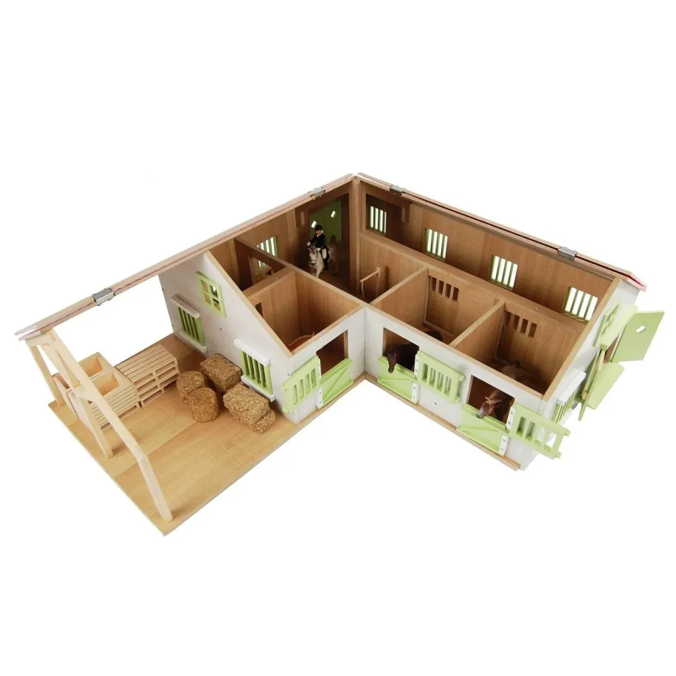 Découvrez cette magnifique écurie en bois rose, verte et blanche à l’échelle 1/24. Elle est composée de 4 boxes pour accueillir les chevaux et d’un espace de stockage. Parfait cadeau pour offrir aux enfants qui adorent les chevaux, le monde de la ferme et le monde équestre. Les fenêtres et les portes peuvent s’ouvrir et se fermer tout comme le toit qui est pliable pour laisser un espace de jeu plus accessible. Les accessoires ne sont pas inclus, A partir de 5 ans.