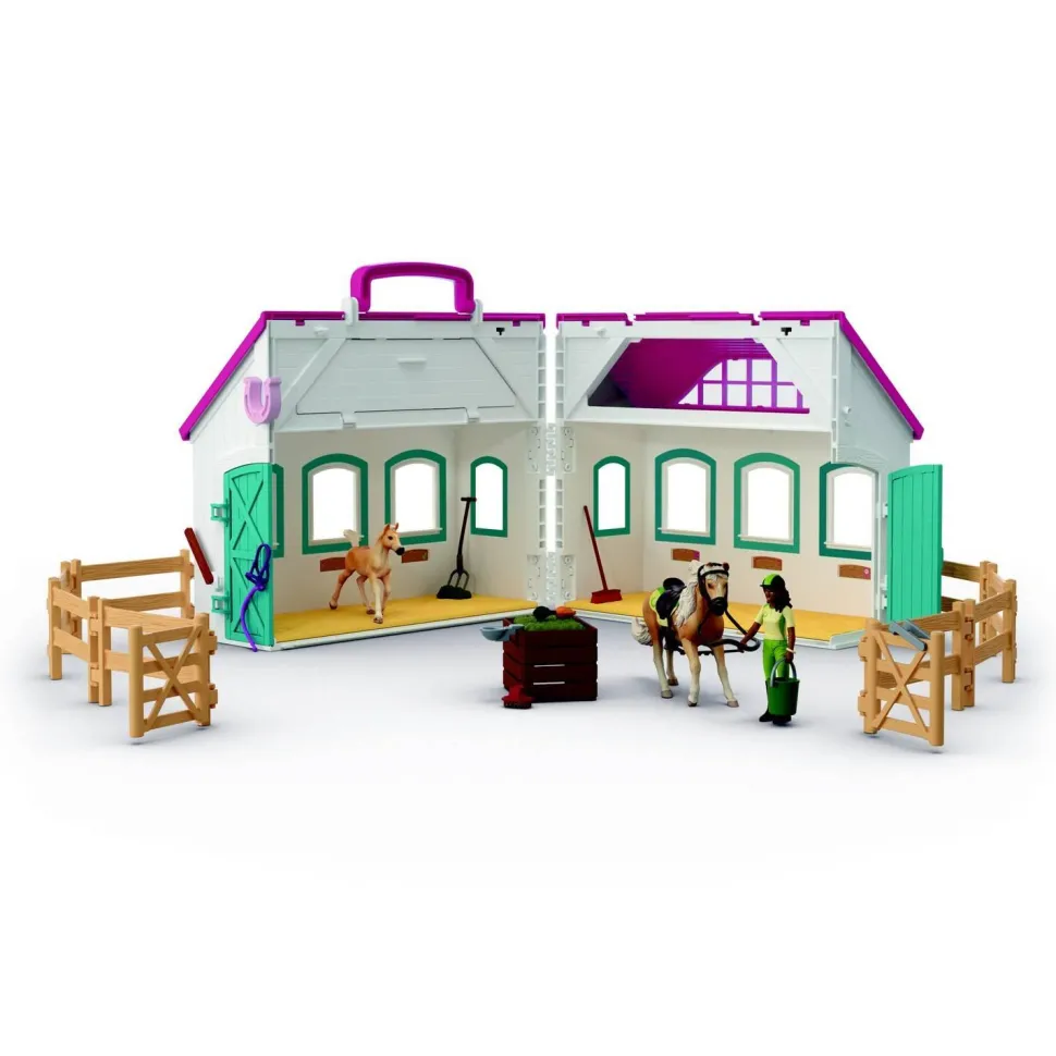 Contenu : 1 bâtiment écurie transportable, 1 Jument Haflinger, 1 Poulain Haflinger, 1 bride avec rênes, 1 selle, 1 licol rose, 1 longe rose, 1 tapis de selle, 1 figurine Sarah, 1 casque, 1 bracelet, 2 éléments de foin, 2 cadres de porte, 2 panneaux de porte, 2 fermetures de porte, 10 éléments de paddock, 1 verrou de porte de paddock, 1 fermeture fer à cheval, 1 râtelier, 1 fourche, 1 seau, 1 balai, 2 balles de foin, 1 portion de foin à enfourcher, 1 peigne, 1 abreuvoir, 1 botte de carottes, 2 lucarnes, 1 planche d’autocollants, 1 notice de montage