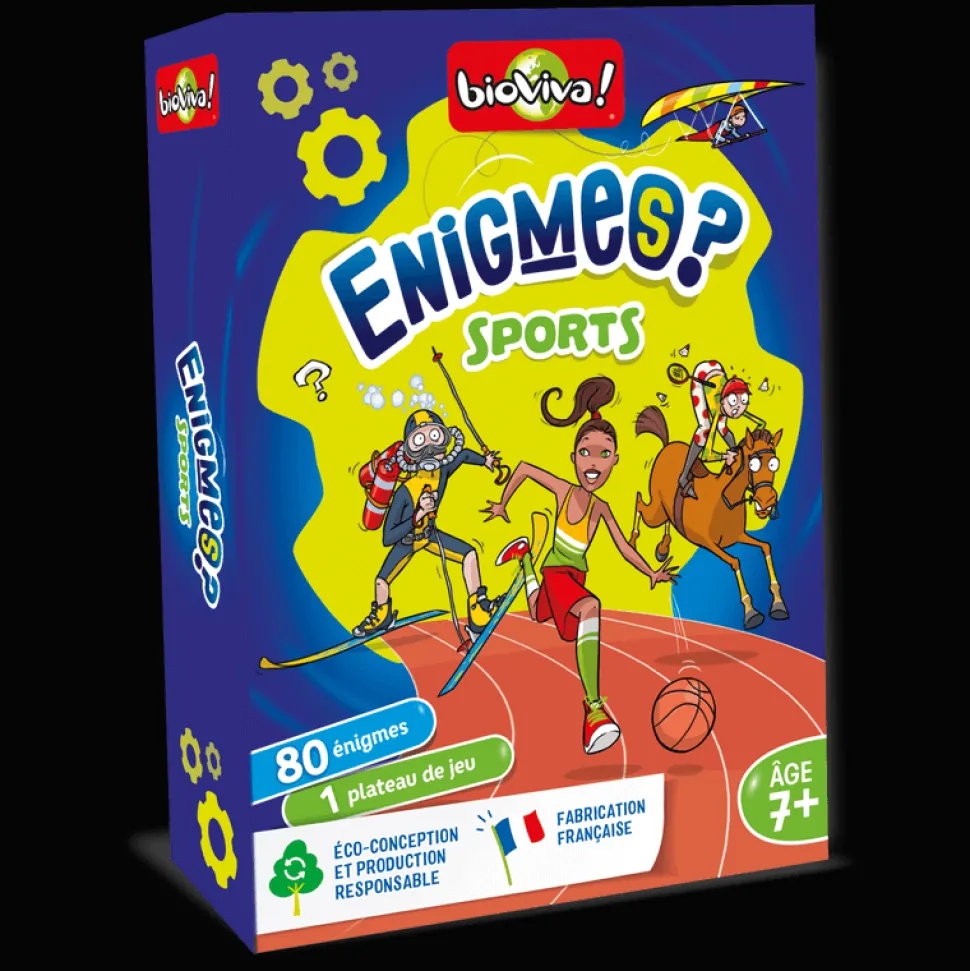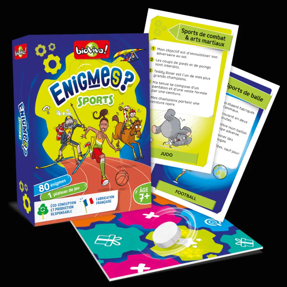 Les énigmes de chez bioviva va permettre aux enfants de ce mettre au défi et de résoudre des énigmes.Il va falloir être le plus rapide à deviner les sports et équipements qui se cachent derrière les 5 indices. Puis faire preuve d’adresse pour gagner encore plus de cartes !Tous les joueurs jouent dans la même équipe. Énoncez les indices de votre carte les uns après les autres. Dès qu’un joueur pense avoir la bonne réponse, il la dit à voix haute. Attention ! Il faudra aussi faire preuve d’adresse en lançant le jeton sur le plateau pour gagner (ou non) plus de cartes…Contenu- 80 énigmes illustrées- 1 plateau de jeu- 1 jeton en bois- 1 règle du jeuDe 2 à 6 joueurs. Dès 7 ans. Fabriqué en France.